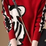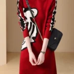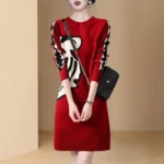 Women’s Knitted Sweater Dress – Autumn/Winter Elegant Pullover with Printed Panels, Round Neck & Long Sleeves | Loose Casual Fit