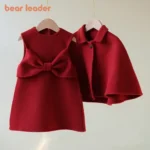 بدلة عيد الميلاد البسيطة للفتيات من Bear Leader فستان بفيونكة كبيرة + عباءة حمراء ومعطف صوفي من قطعتين ملابس أطفال شتوية دافئة ملابس رأس السنة الجديدة