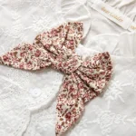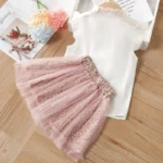 طقم ملابس صيفي للبنات لعام ٢٠٢٤ – تي شيرت أبيض بطبعة زهور وتنورة بفيونكة، طقم من قطعتين