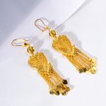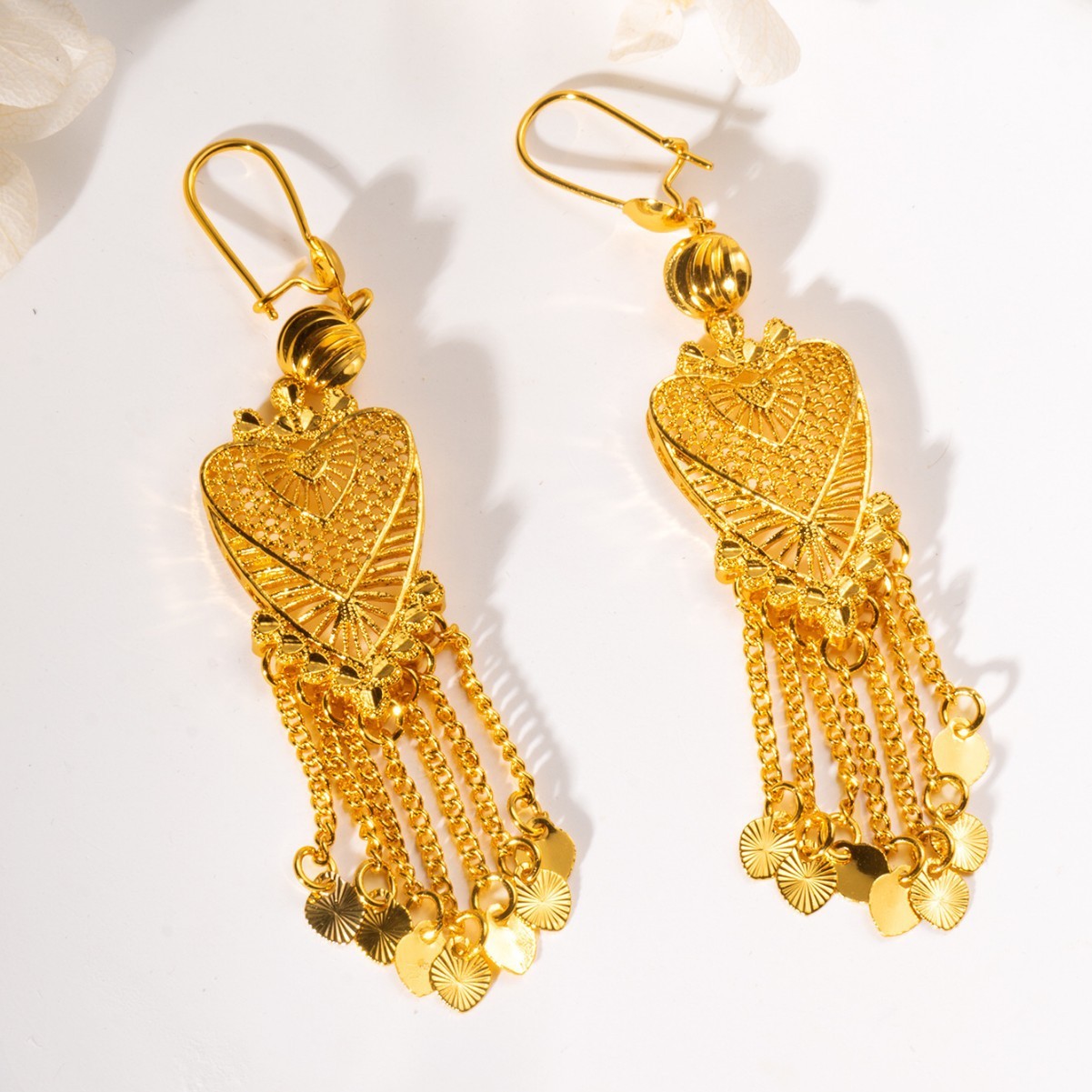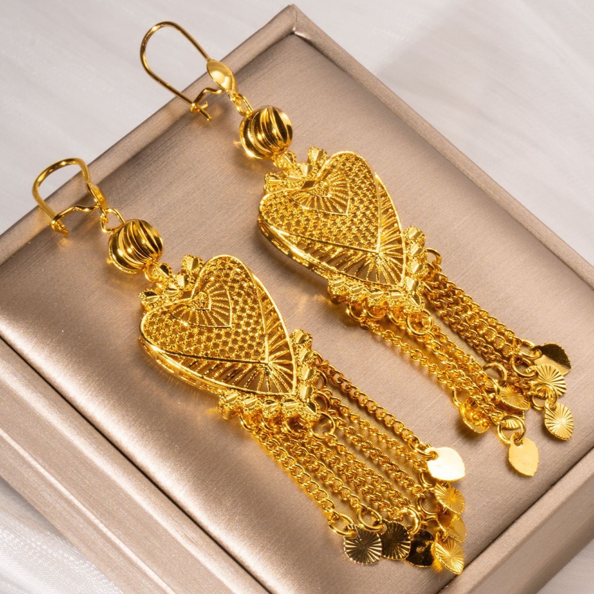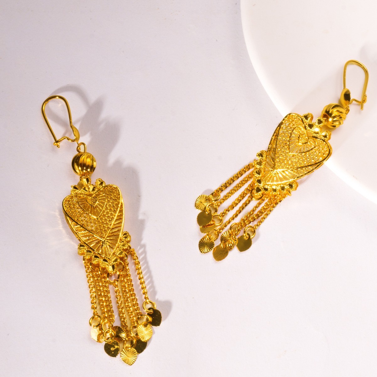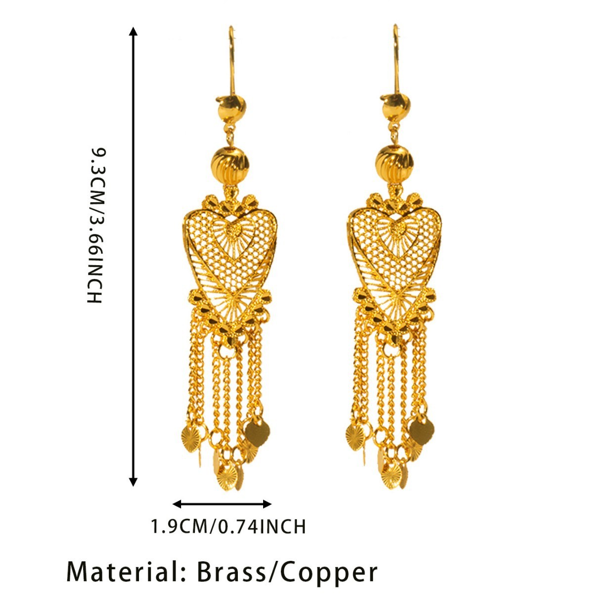 أقراط نسائية طويلة من النحاس الأصفر على شكل قلب مجوف مزينة بشرابة، بتصميم كلاسيكي