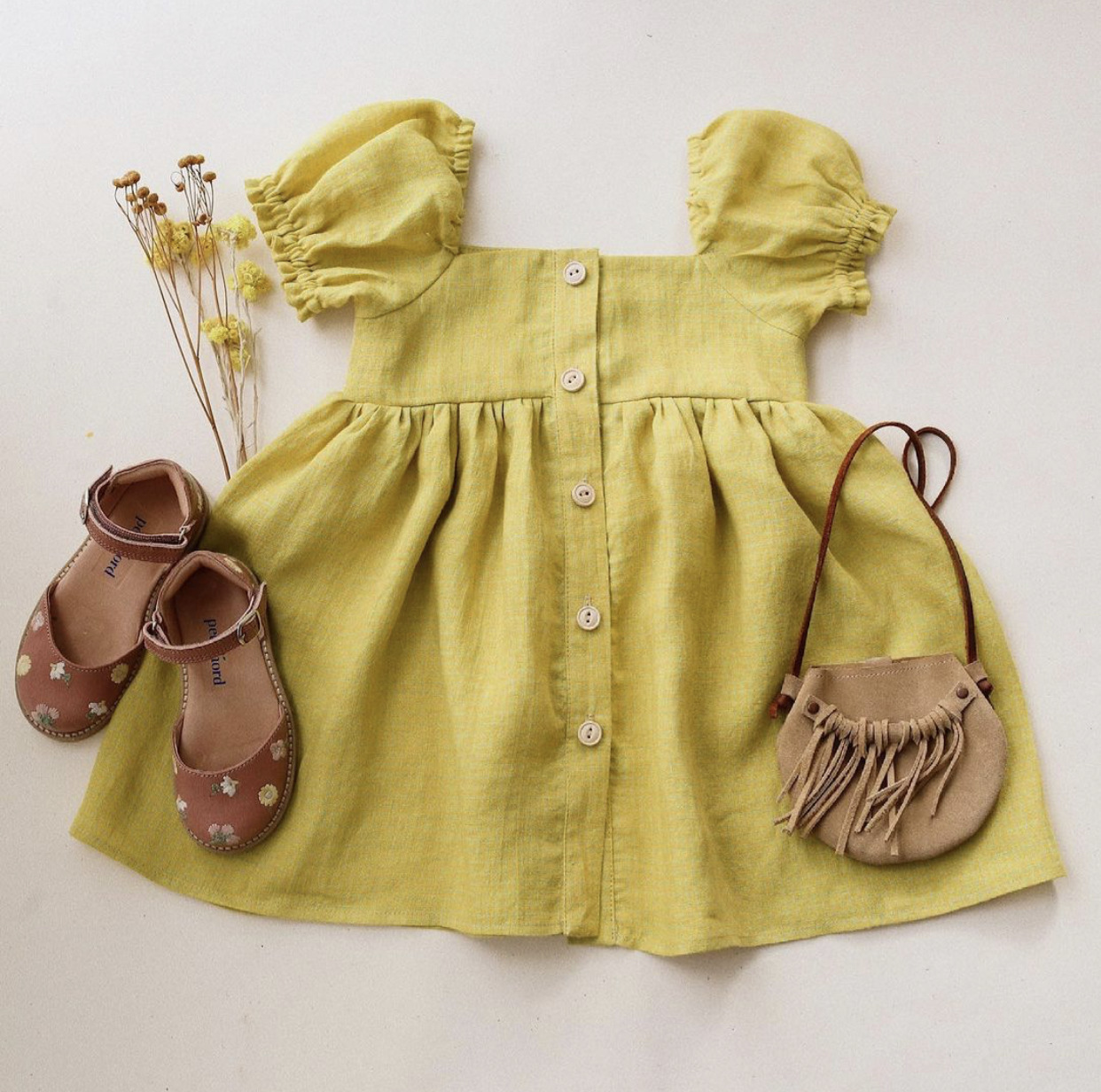 أكمام منفوخة، فستان أميرة، فساتين بنات، رقبة مربعة، أكمام قصيرة من القطن والكتان