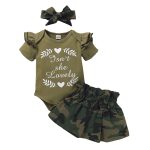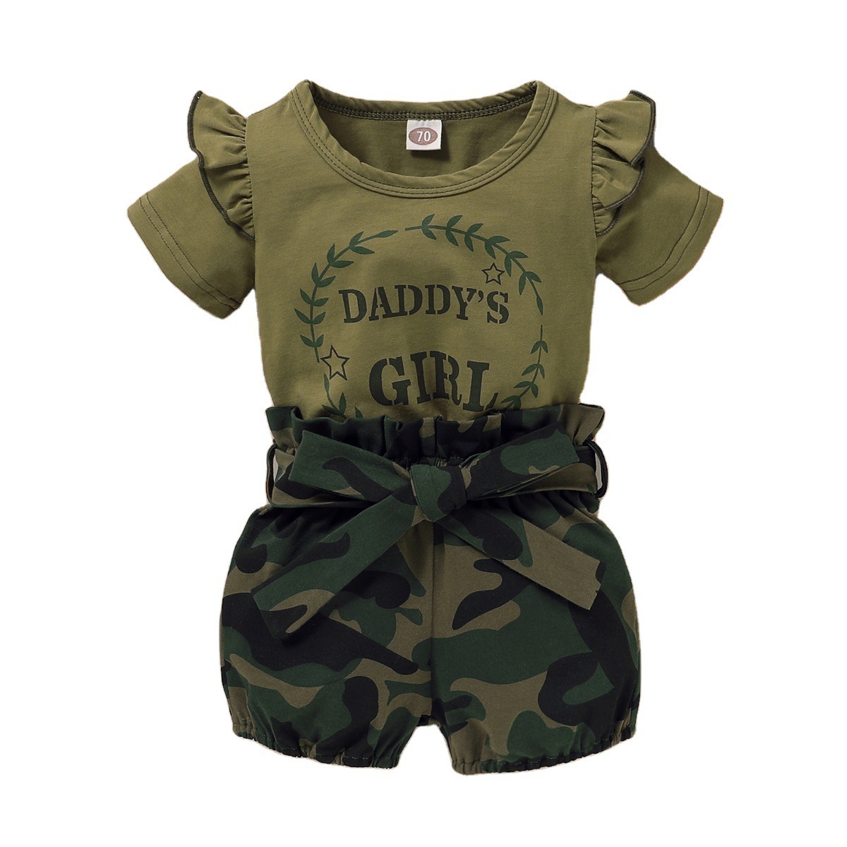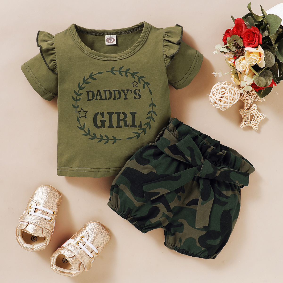 بلوزة قصيرة الأكمام مطبوعة بحروف للبنات، وتنورة مموهة من ثلاث قطع