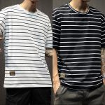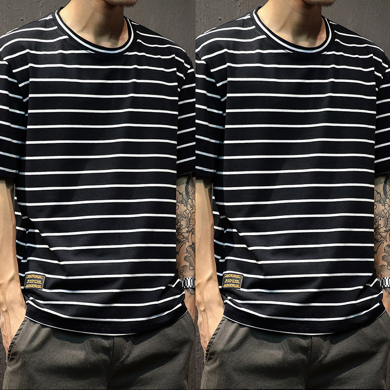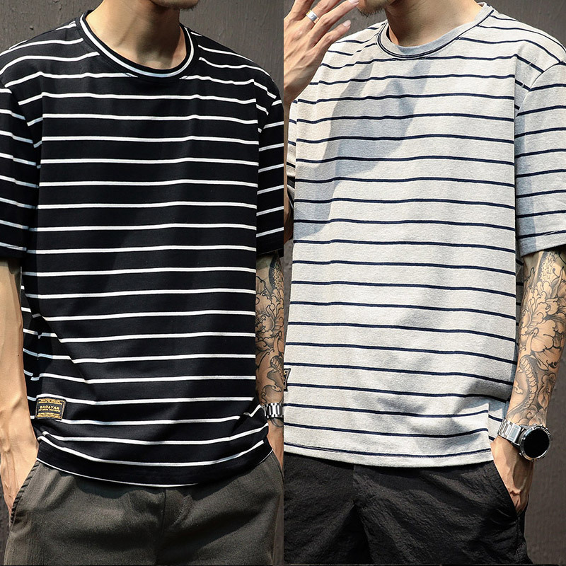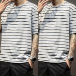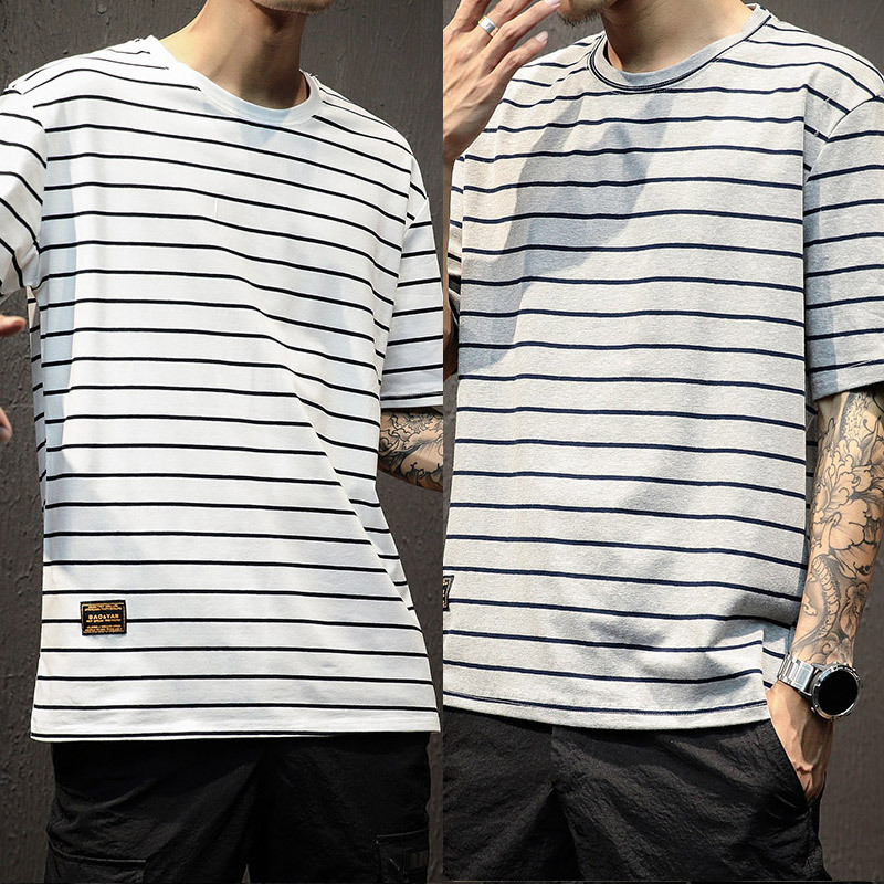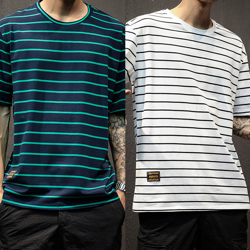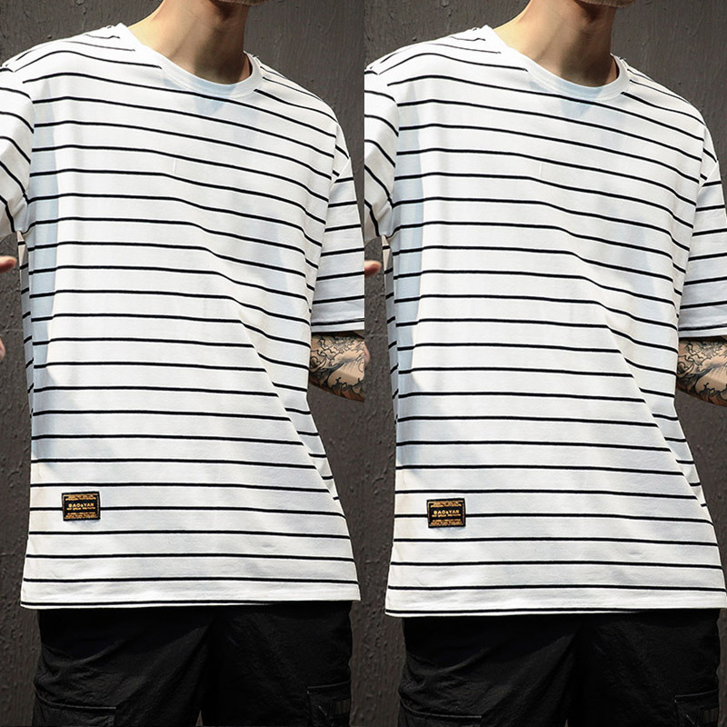 تي شيرت مخطط بأكمام قصيرة للرجال، ملابس بمقاسات كبيرة، فضفاض، نصف كم
