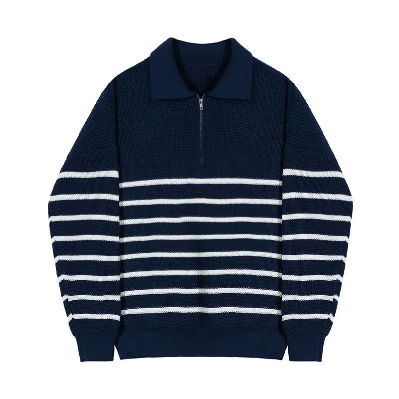 سترة رجالية كورية خفيفة الوزن بأكمام طويلة بتصميم عتيق فضفاضة غير رسمية بنصف سحاب ومخططة لفصل الخريف