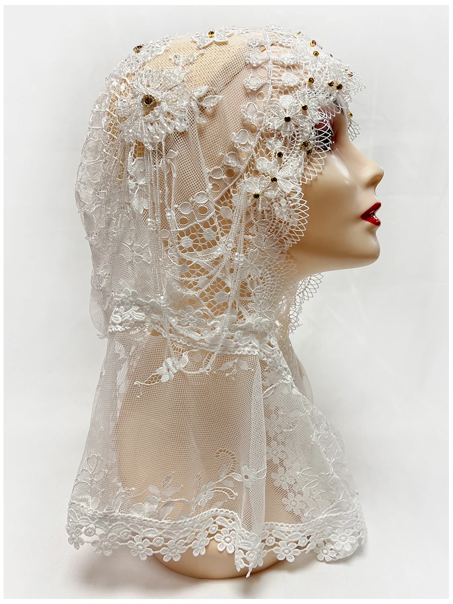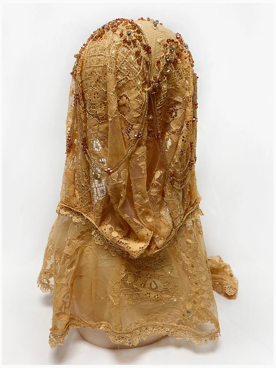 سجادة صلاة مطرزة مستوحاة من دبي – غطاء رأس إسلامي ناعم من الدانتيل مع خرز وتفاصيل أكريليك