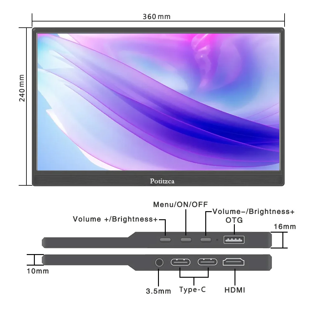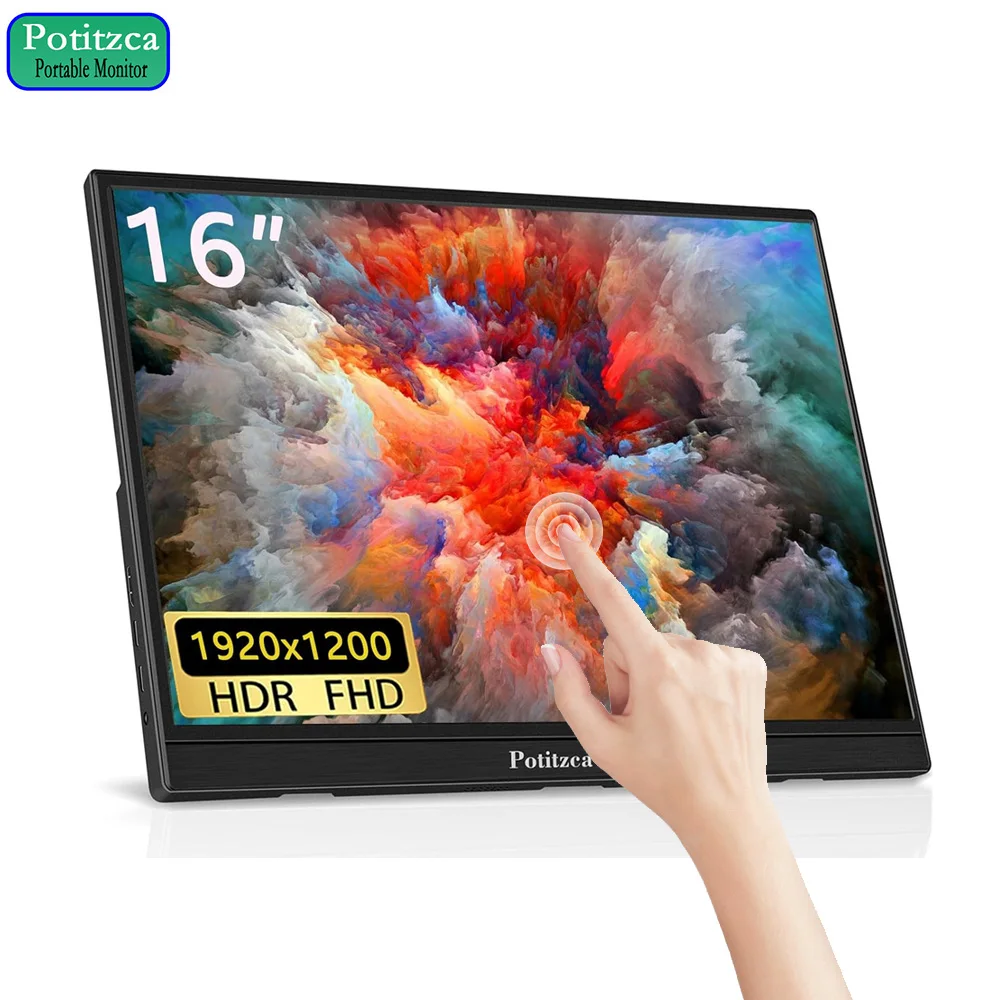 شاشة محمولة مقاس 16 بوصة تعمل باللمس مقاس 1920 × 1200 لوحة IPS عالية الوضوح بالكامل 16:10 منفذ USB من النوع C HDMI للكمبيوتر المحمول/ماك/الهاتف/PS4/Xbox/المفتاح