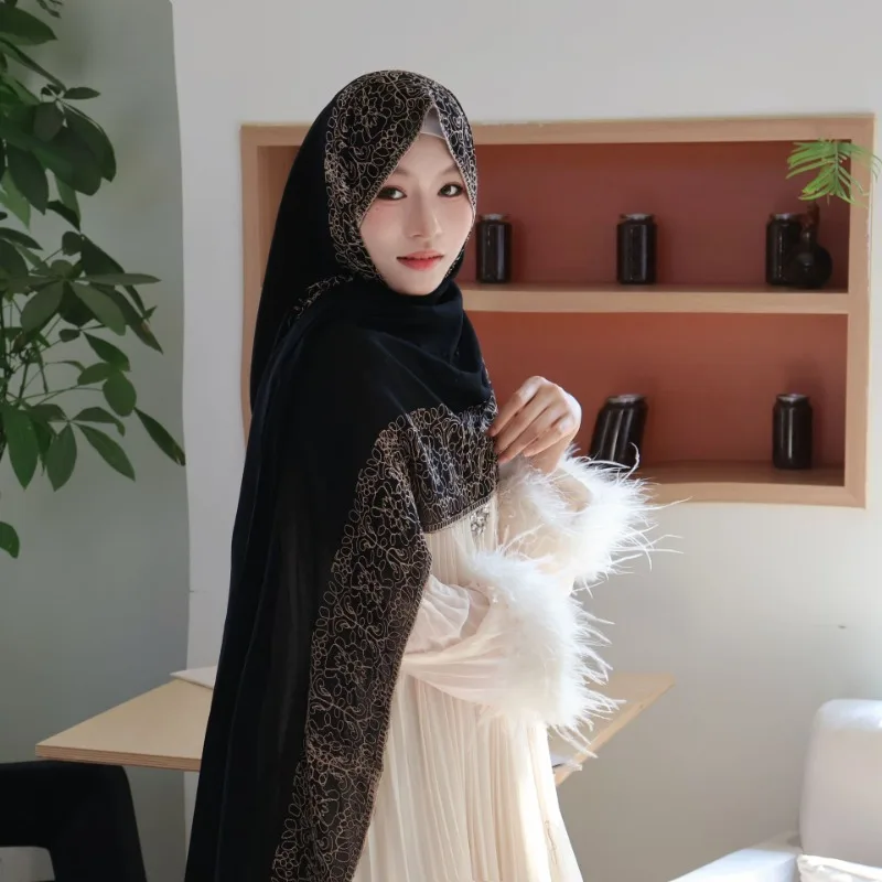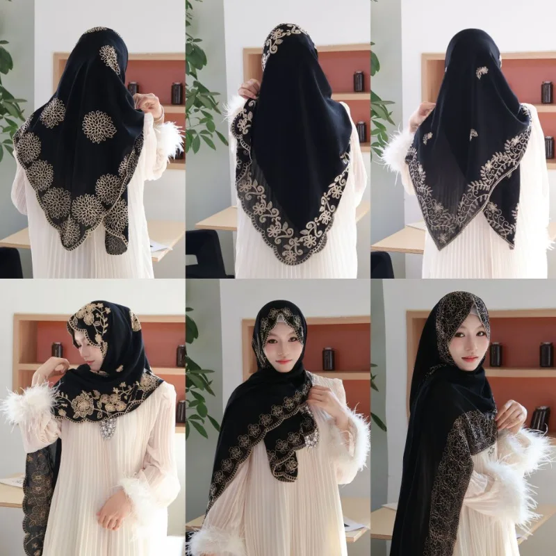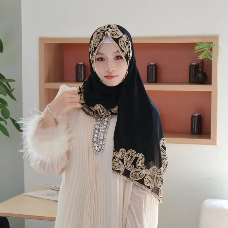 شال دانتيل مطرز يدويًا – وشاح قطني أسود عتيق وغطاء رأس عرقي للنساء