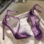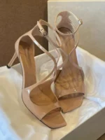 صندل بإبزيم فم السمكة مع مقدمة مربعة للنساء في الصيف بتصميم جديد من الجلد اللامع بلون البشرة حذاء مثير مفتوح الأصابع بكعب عالٍ