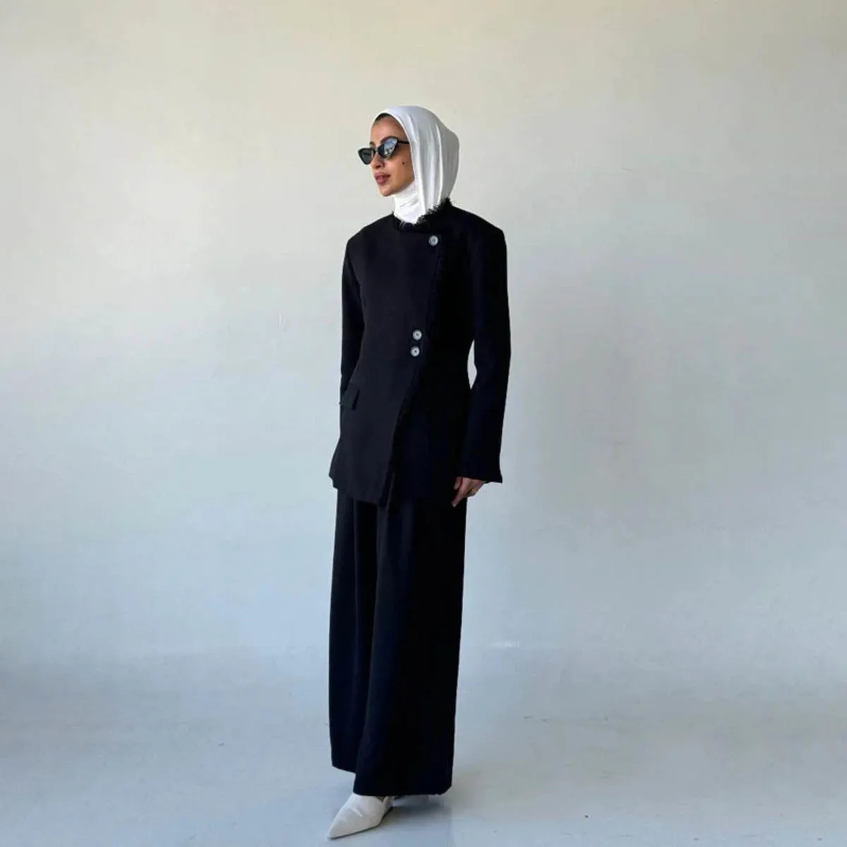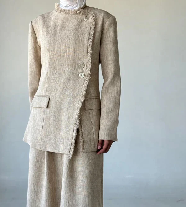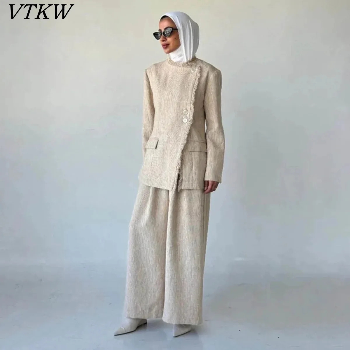 طقم بدلة VTKW ربيع 2025 بأكمام طويلة ولون سادة ورقبة مستديرة وحواف مهدبة مناسب للمناسبات المتعددة