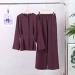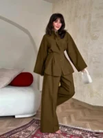 طقم بنطلون مطوي من قطعتين – بلوزة بأكمام طويلة وأزرار وبنطلون واسع الساق