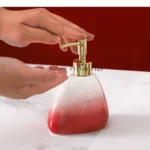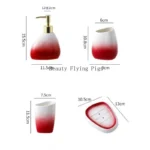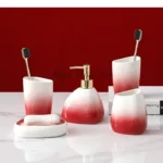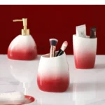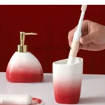 طقم حمام سيراميكي أحمر متدرج – موزع صابون، طبق، وكوب غسول فم، مناسب للمنزل، أو الفندق، أو كهدية زفاف
