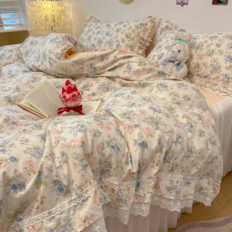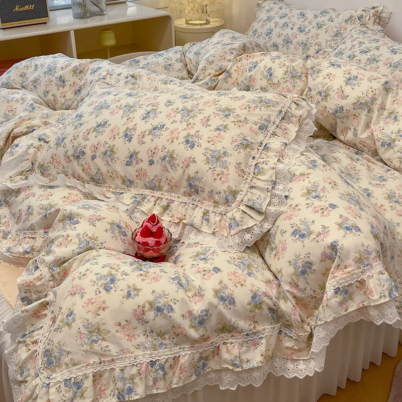 طقم سرير من 4 قطع بنقشة زهور فرنسية عتيقة من الدانتيل المكشكش – غطاء لحاف قطني 100% مع تنورة سرير/ملاءة وأغطية وسائد