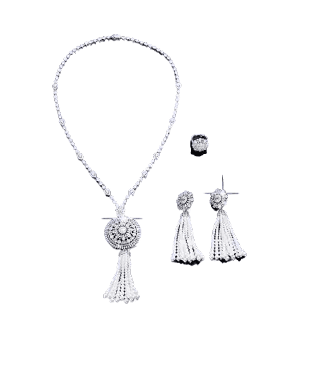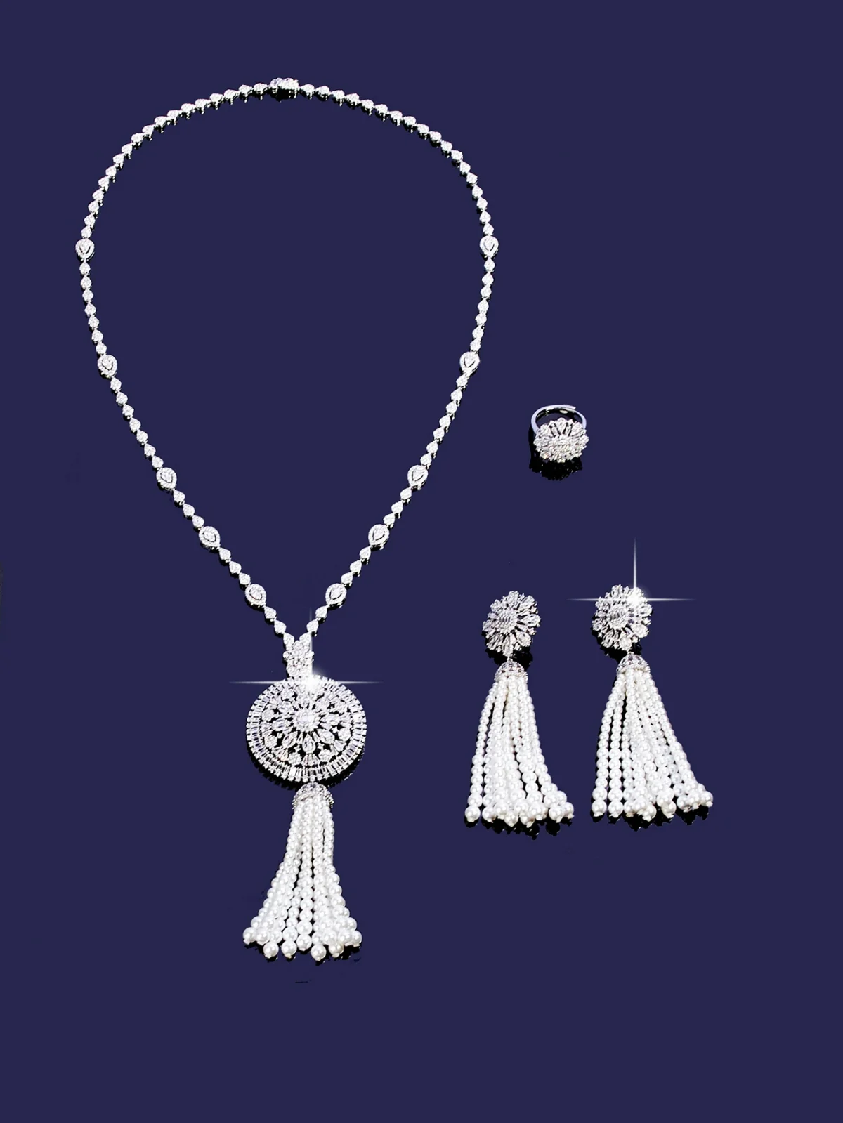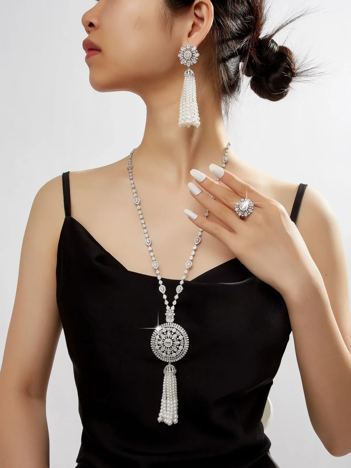 طقم مجوهرات فاخر من اللؤلؤ والزركونيا – عقد وأقراط زفاف