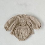 طقم ملابس بناتي غربي الطراز، بلوزة بأكمام منفوخة بنقشة مربعات، مع بنطال قصير.