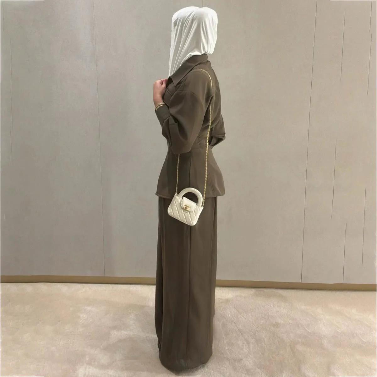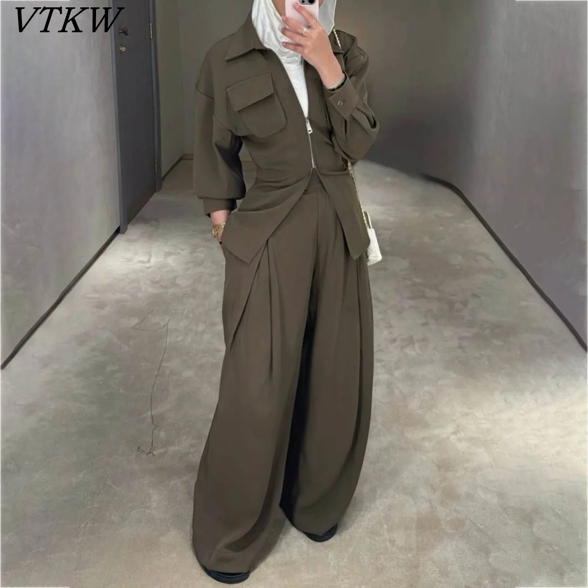 طقم من قطعتين من سترة نسائية عالية الجودة وبنطلون فضفاض من VTKW بتصميم مقيد للخصر وسحاب وياقة بلون نقي لربيع وصيف 2025