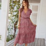 فساتين صيفية بأكمام قصيرة مزينة بكشكشة وياقة على شكل V وحزام ملفوف وفتحة جانبية بطبعة زهور بوهيمية فستان طويل غير رسم