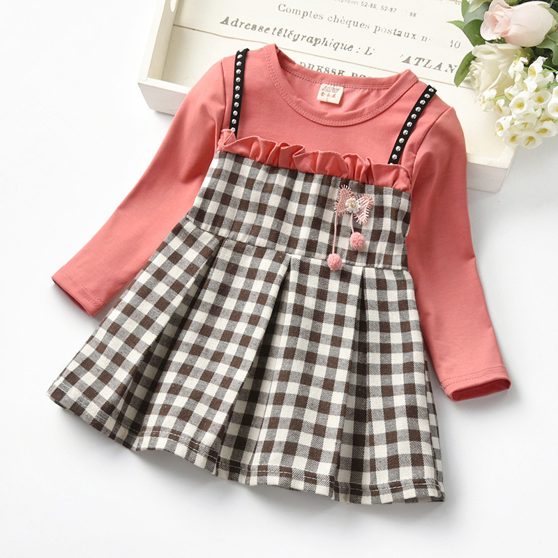 فستان بناتي طويل الأكمام مزين بنقشة مربعات من المصنع، مناسب لفصل الخريف، فستان أميرة من قطعتين مزين بالدانتيل الصناعي.