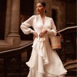 فستان حفلة راقصة برقبة على شكل V وأكمام طويلة وكشكشة فستان حفلة راقصة طويل فساتين أنيقة للنساء فستان ساتان أبيض ملابس نسائية متعددة الطبقات غير رسمية