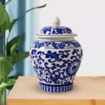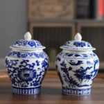 مزهرية زخرفية من الخزف الصيني على شكل جرة زنجبيل مع غطاء، مزهرية خزفية زرقاء وبيضاء لتزيين المطاعم
