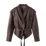 معطف جلدي أحادي الصدر بياقة خضراء رجعية مع حزام للنساء