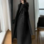 معطف ميا ميوز خريف وشتاء 2025 أنيق بلون سادة وأكمام طويلة وصدرية مزدوجة ومعطف طويل للسيدات