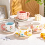 300 مل كوب سيراميك لطيف غير منتظم مصنوع يدويًا بنمط زهرة وقلب كوب قهوة كوب شاي بالحليب للإفطار هدية للأطفال والفتيات