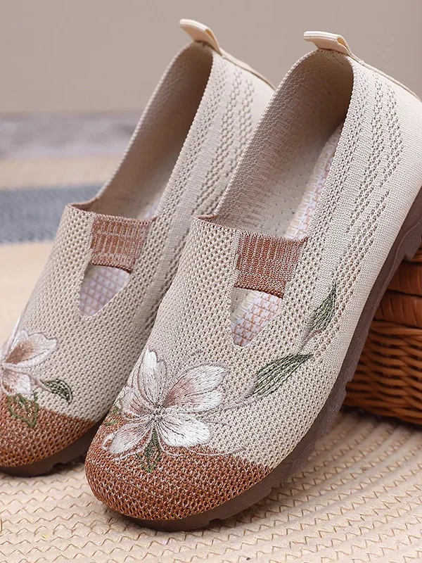 Ladies’ summer 2025 breathable soft sole anti-slip mom shoes leisure mesh flat embroidered shoes