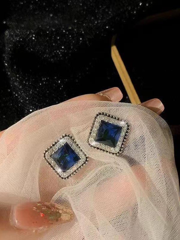 Korean Fashion Blue Diamond Square Minimalist Temperament Personality Square Earrings For Women