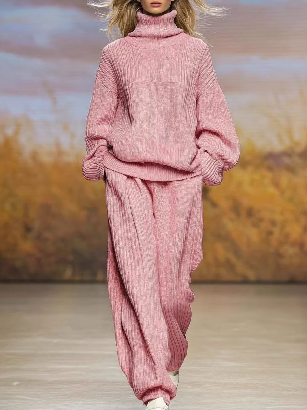 Knitted Loose Fitting Turtleneck And Wide Leg Pants Set
