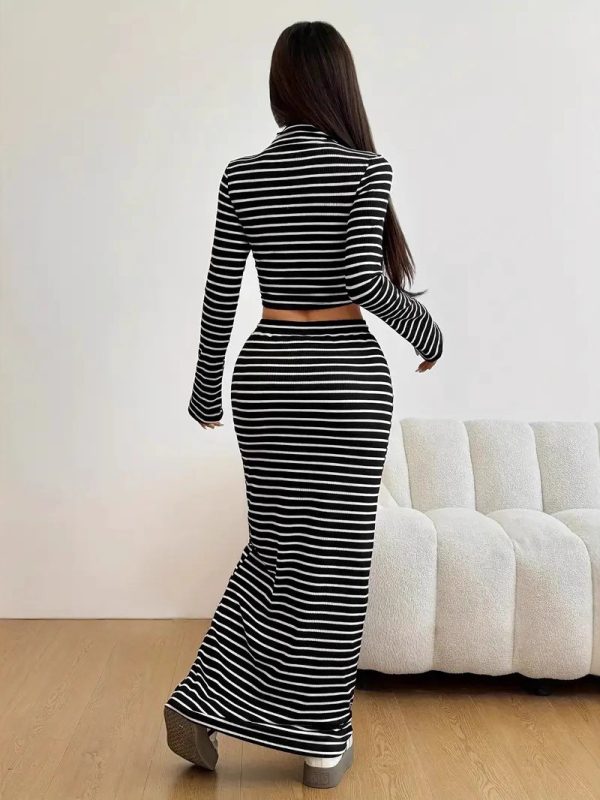 Half-turtleneck Long-sleeve Top With A Drawstring-waisted Long Skirt In A Striped Set