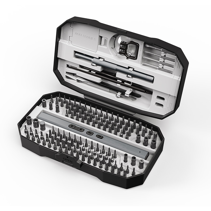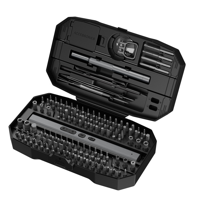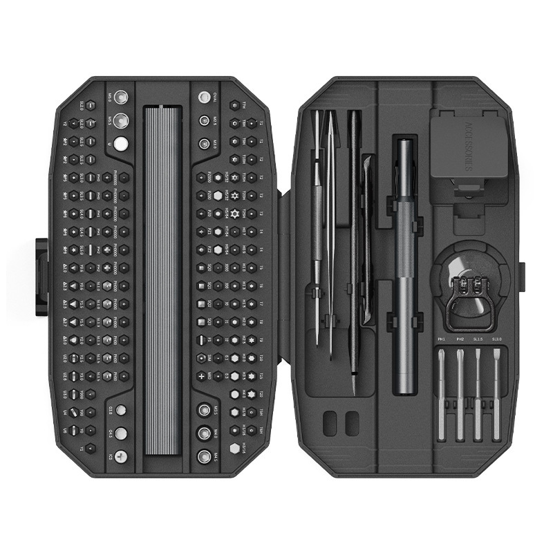 Accessories: electric handle * 1, manual handle * 1, suction cup * 1, short crowbar * 1, metal crowbar * 1, tweezers * 1, hose extension rod * 1, plastic length crowbar * 1, thin pry sheet * 4, bit * 140, addition and subtraction magnetic area * 1