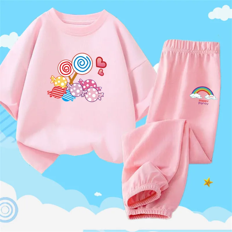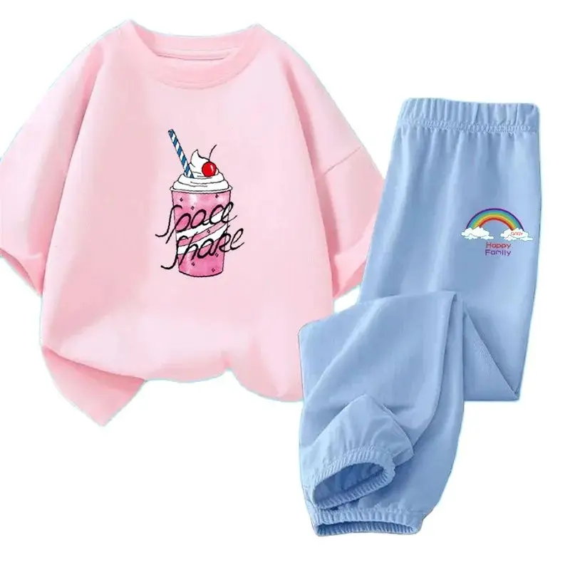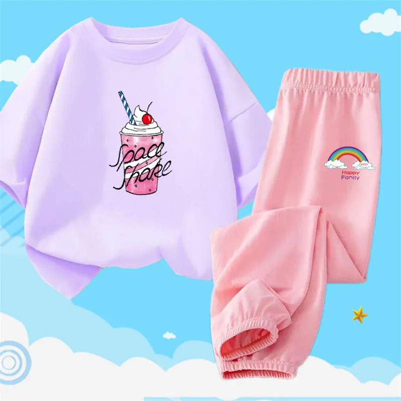 2024 Girls’ Summer Outfit Set – Milkshake Tee & Pants (Ages 3–14)