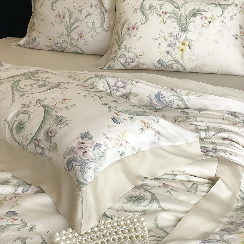 Flower Luxury Bedding Set Lyocell Soft Silky Bed Sheet Pillowcase 4Pcs