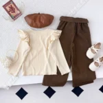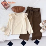 Bear Leader Autumn Girls’ 2-Piece Set (Ages 3-7) – Long Sleeve Mushroom-Trim Top & Brown Pants