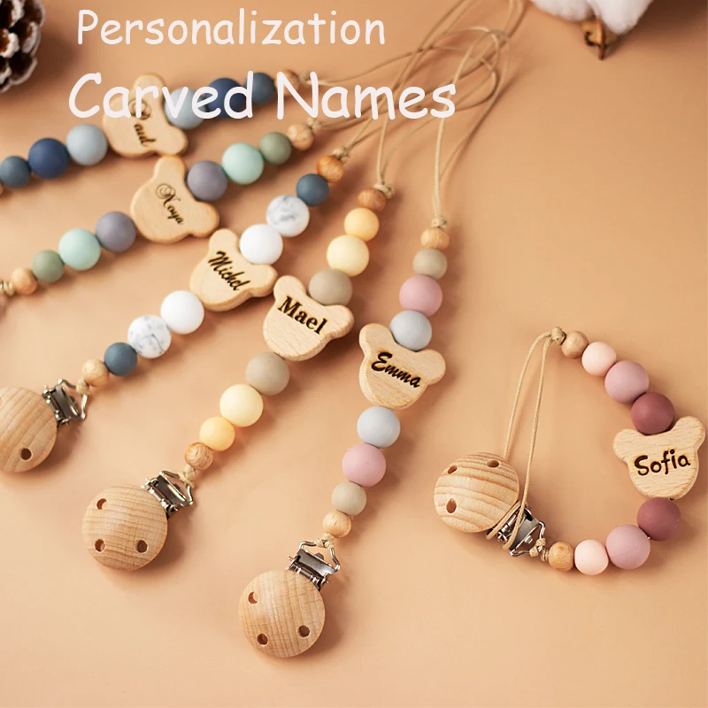 Custom Name Wooden Personalized Baby Pacifier Chain – Silicone Bead Dummy Holder & Teether Pendant | Newborn Gift & Nipple Guard Accessory