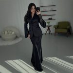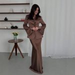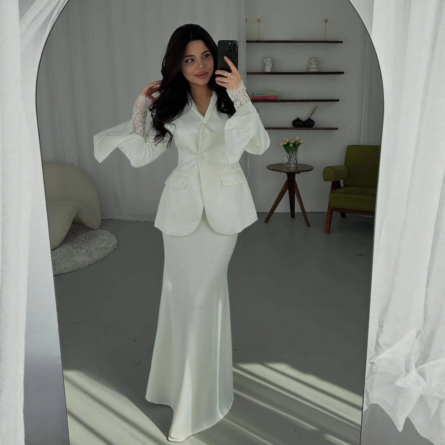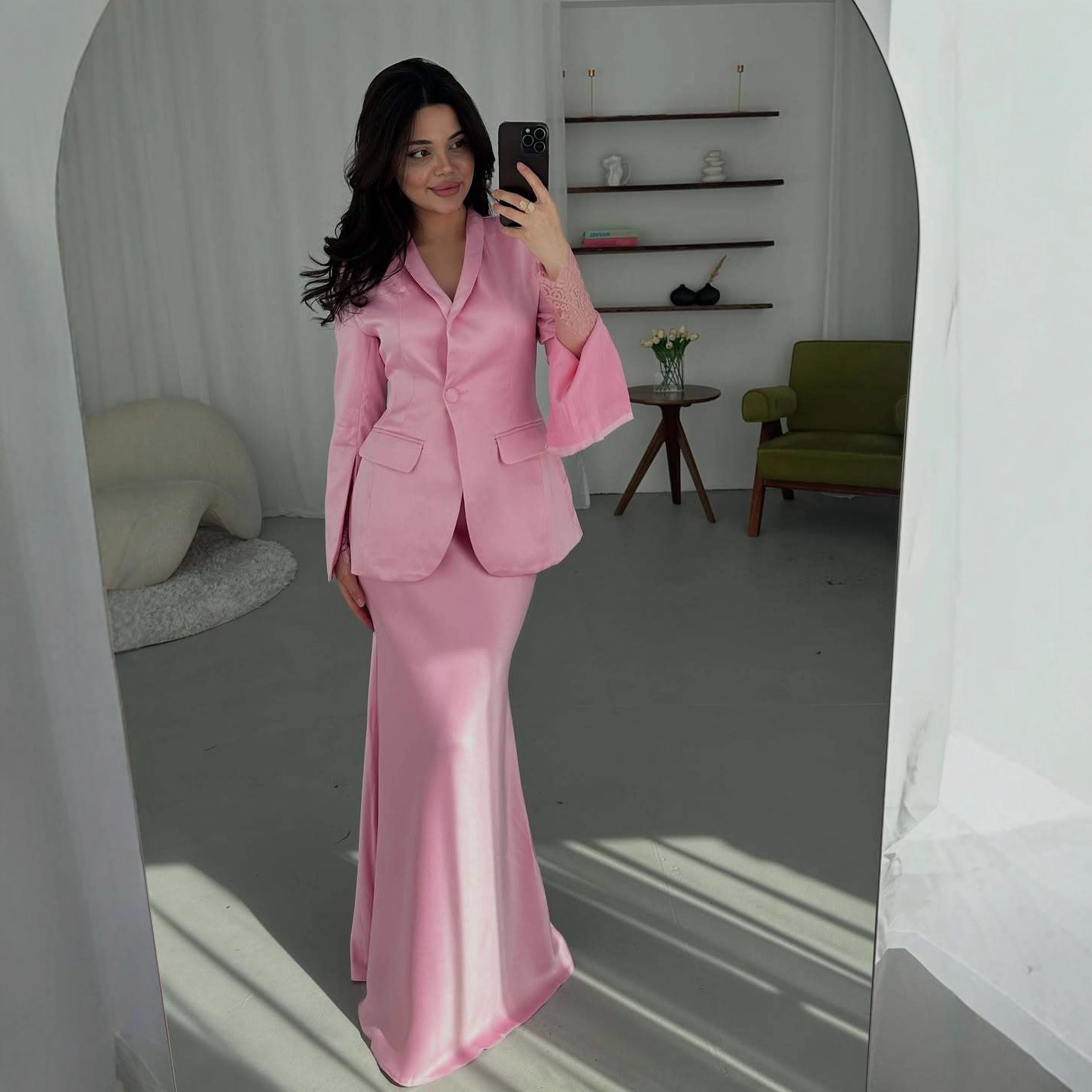 Elegant Slim-fit Solid-color Suit Jacket And Satin Maxi Skirt Set