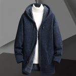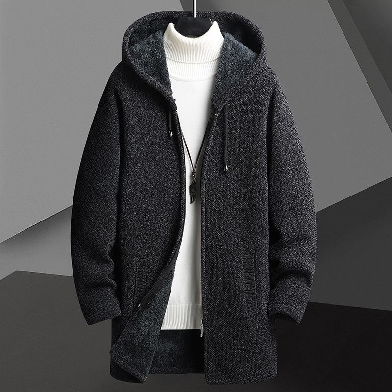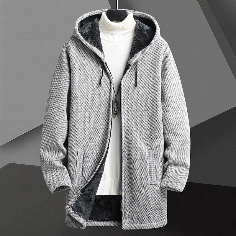 Fall Winter Men Fleece-lined Mid-length Zipper Hooded Sweater Cardigan