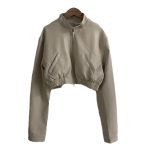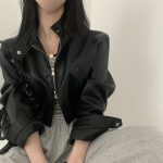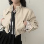 French Style Retro Design Zipped Stand Collar Elastic And Waisted Short Biker’s Leather Jacket Women