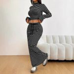 Half-turtleneck Long-sleeve Top With A Drawstring-waisted Long Skirt In A Striped Set