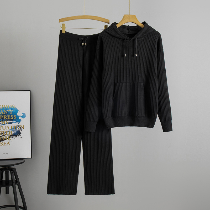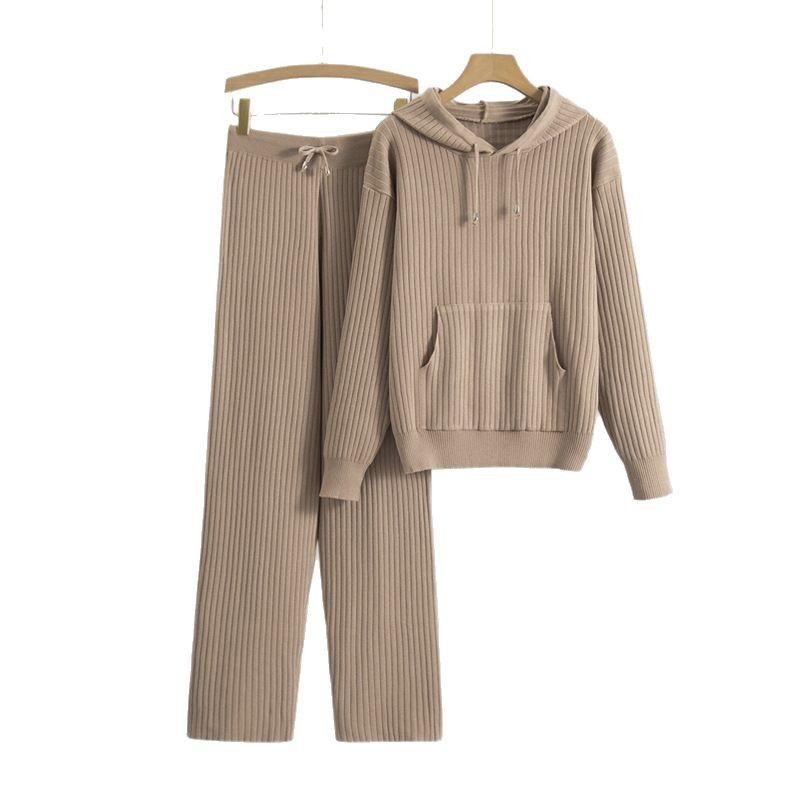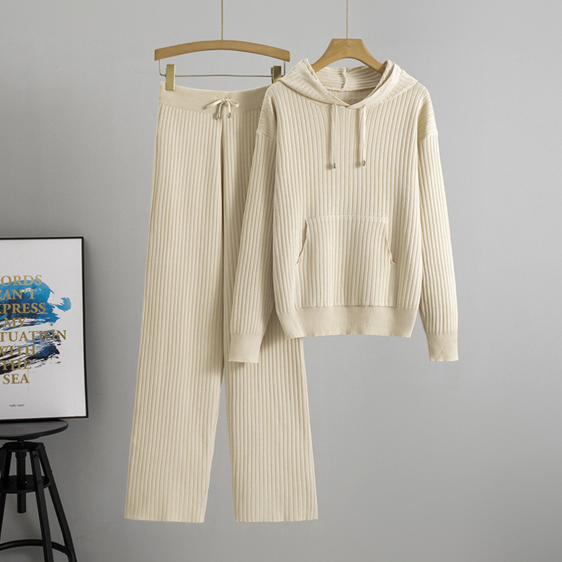 Hooded Knitted Sweater Set With Ribbed Detailing Casual Outfit