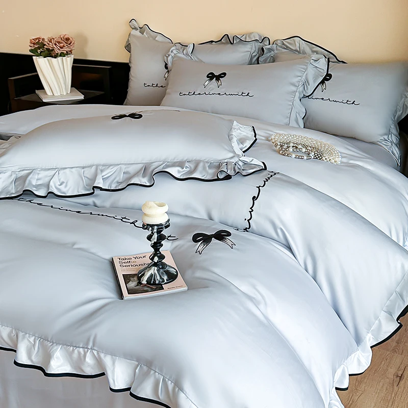 Ins Style Korean Bedding Set Lace Seersucker 4-piece Bed Sheet Set Quilt Cover Solid Duvet Cover For Girl Spring Decor Home