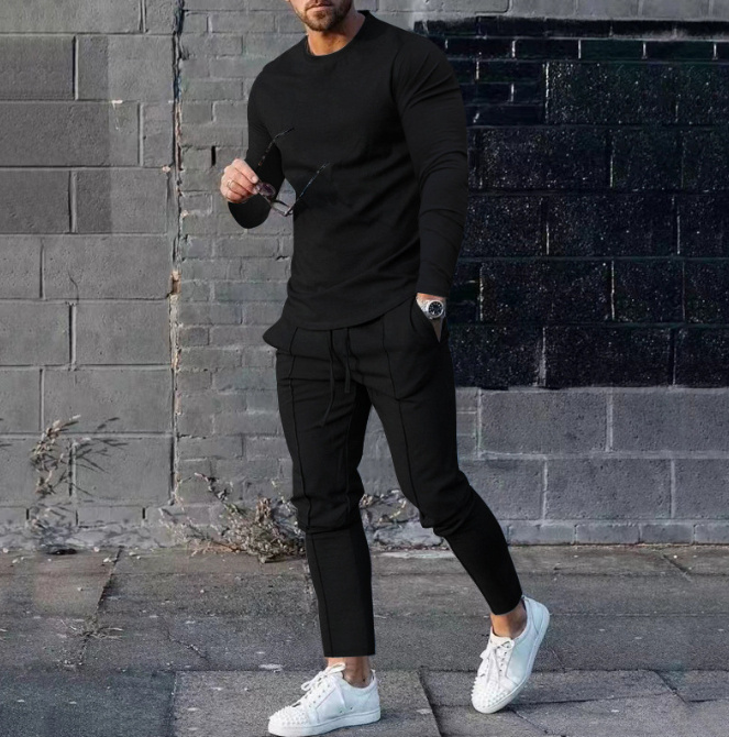 Men’s Long-sleeved Suit Slim Crew Neck Pullover T-shirt And Pockets Drawstring Pencil Pants Casual Trousers Set Clothing