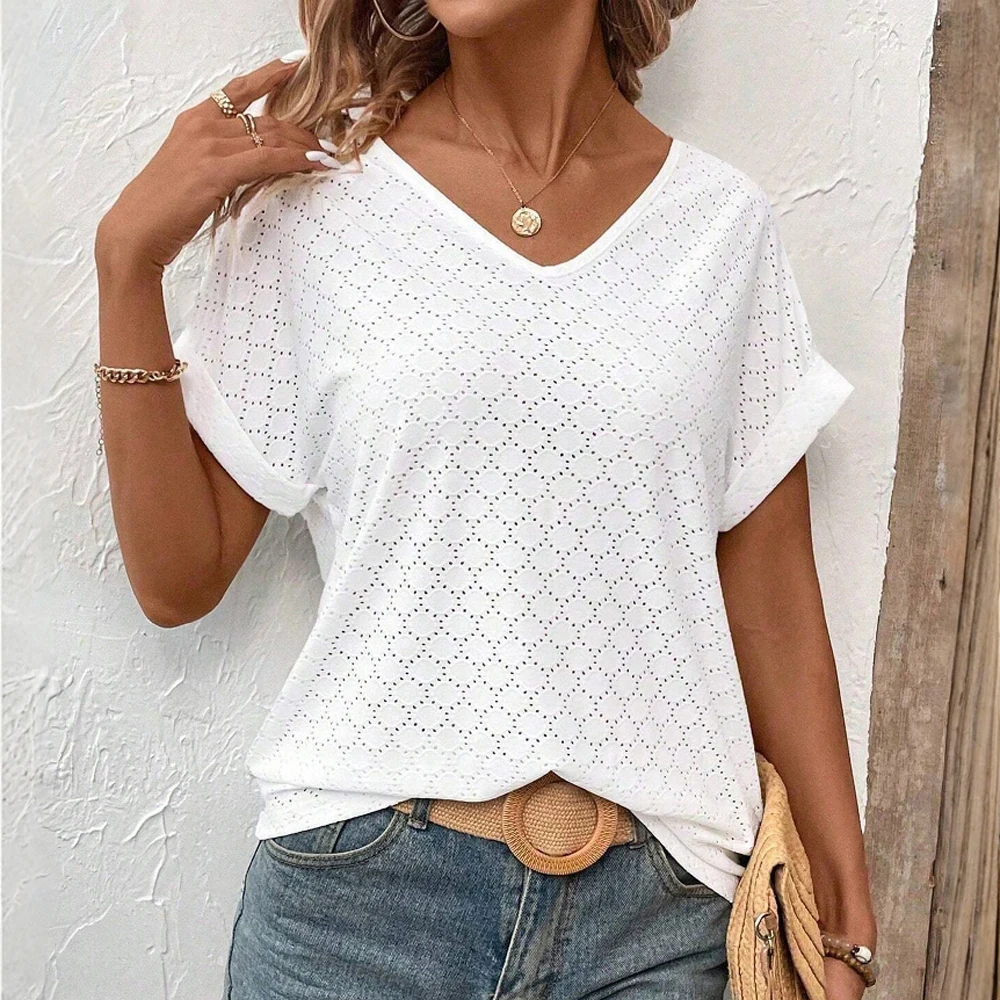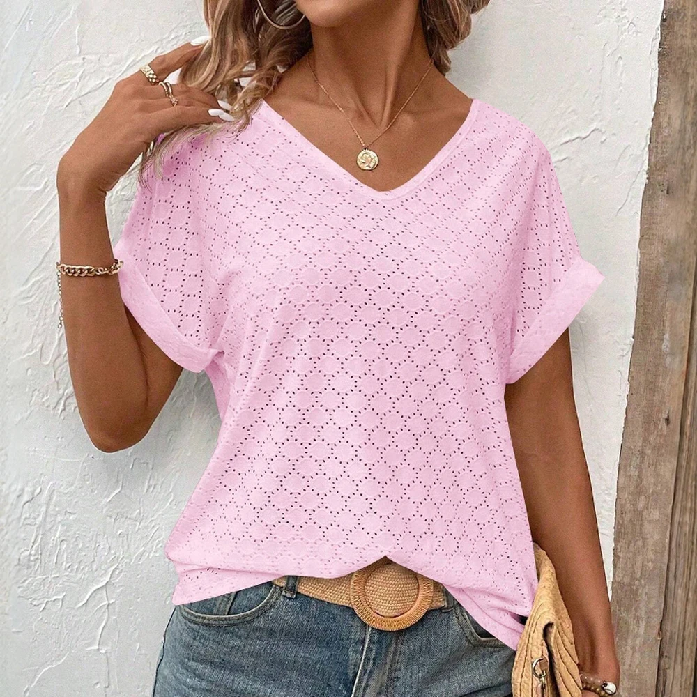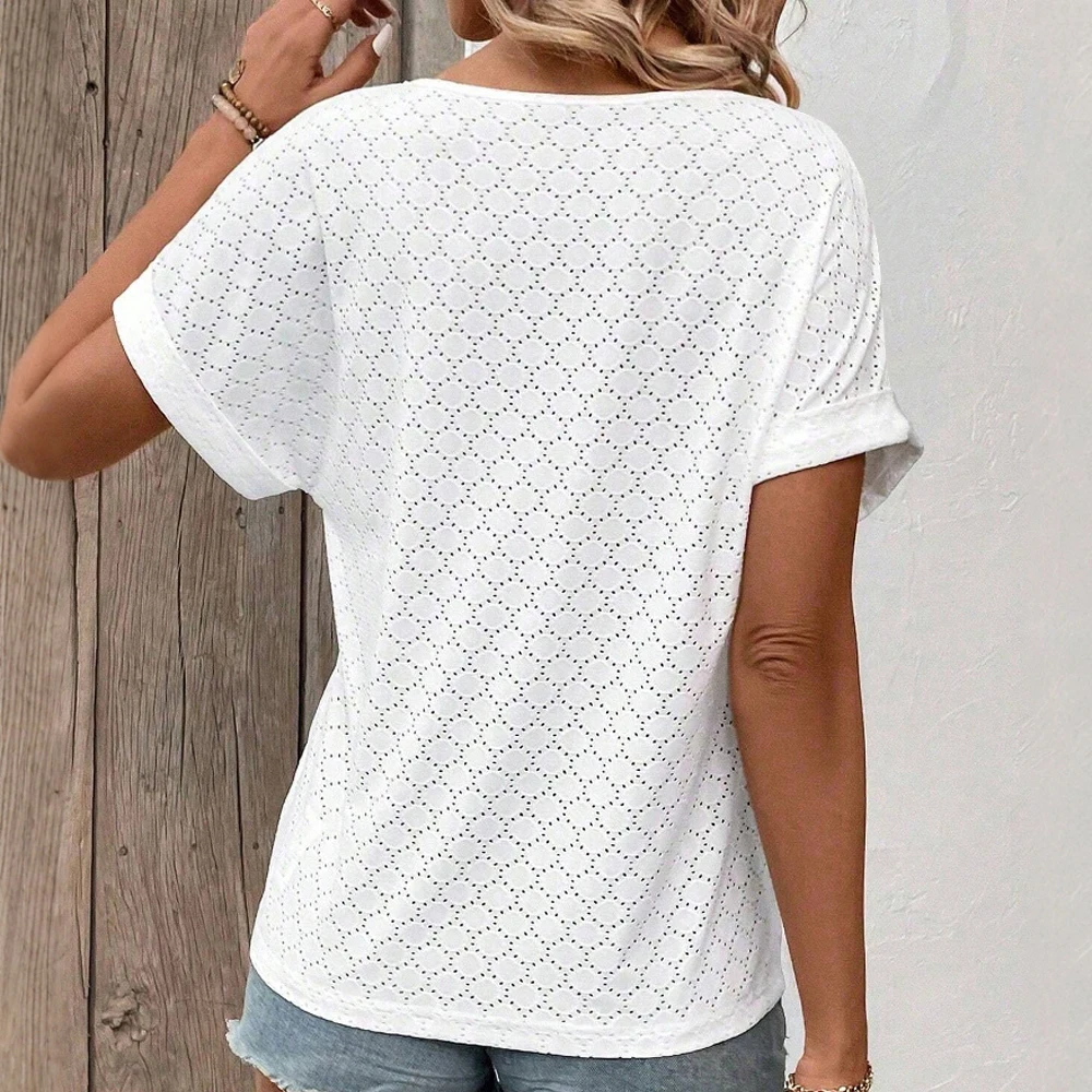 Mia Muse Women’s T-shirts Summer Comfortable Fashion 2025 Plain Hollow Out Short Sleeve V-Neck Casual T-shirts