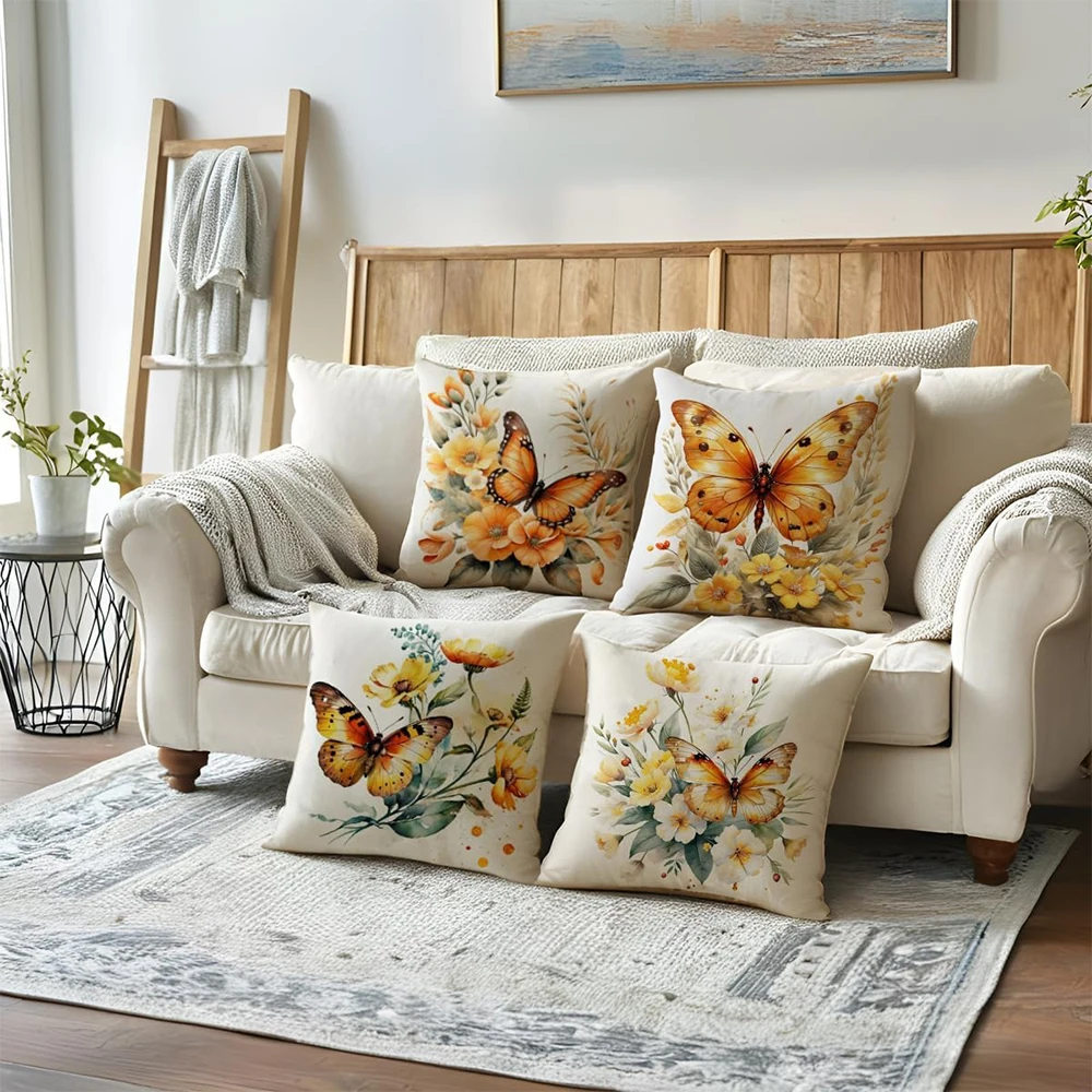 Orange Butterfly and Golden Chrysanthemum Pastoral Style Pillowcase Bedroom Sofa Decorative Cushion Cover with Zipper
