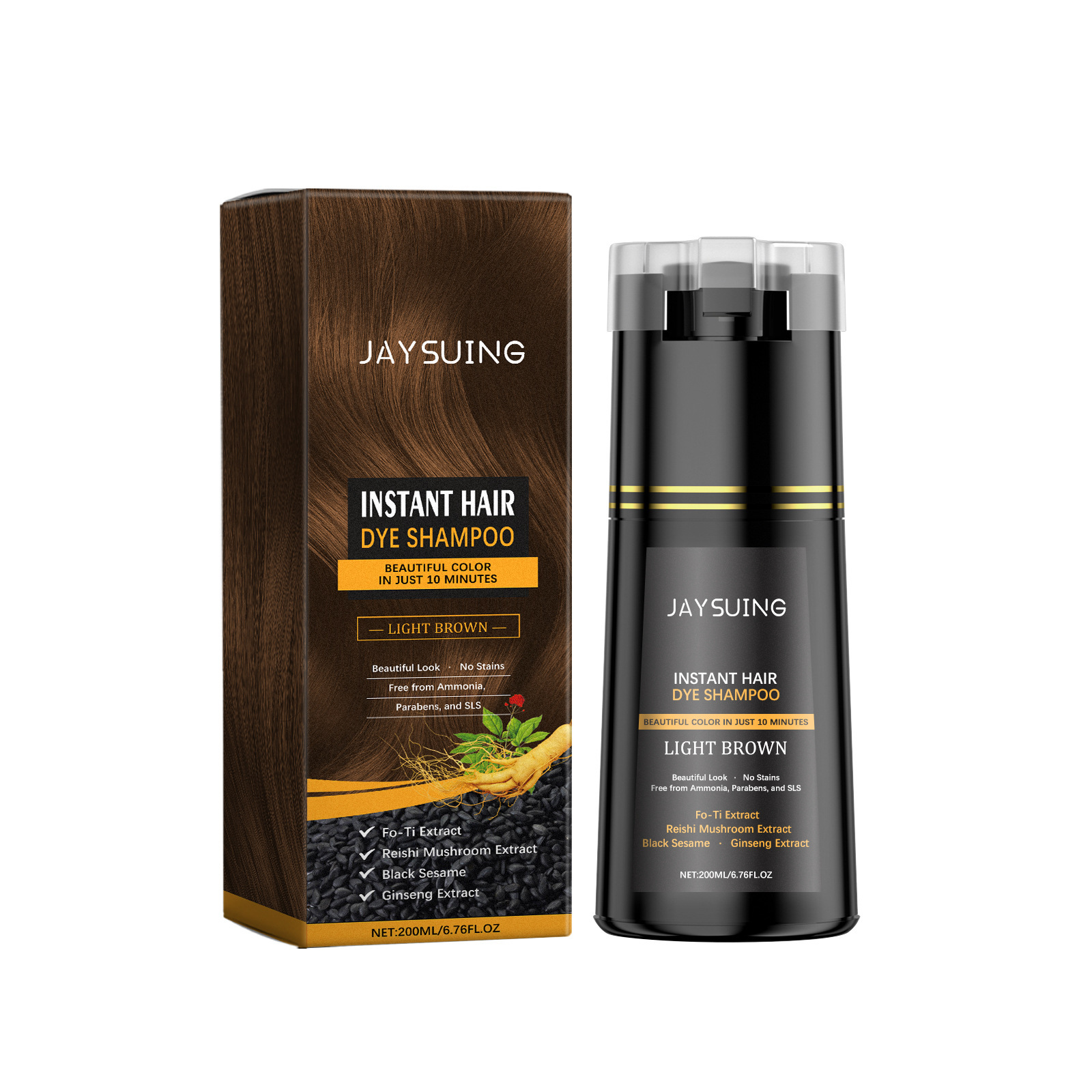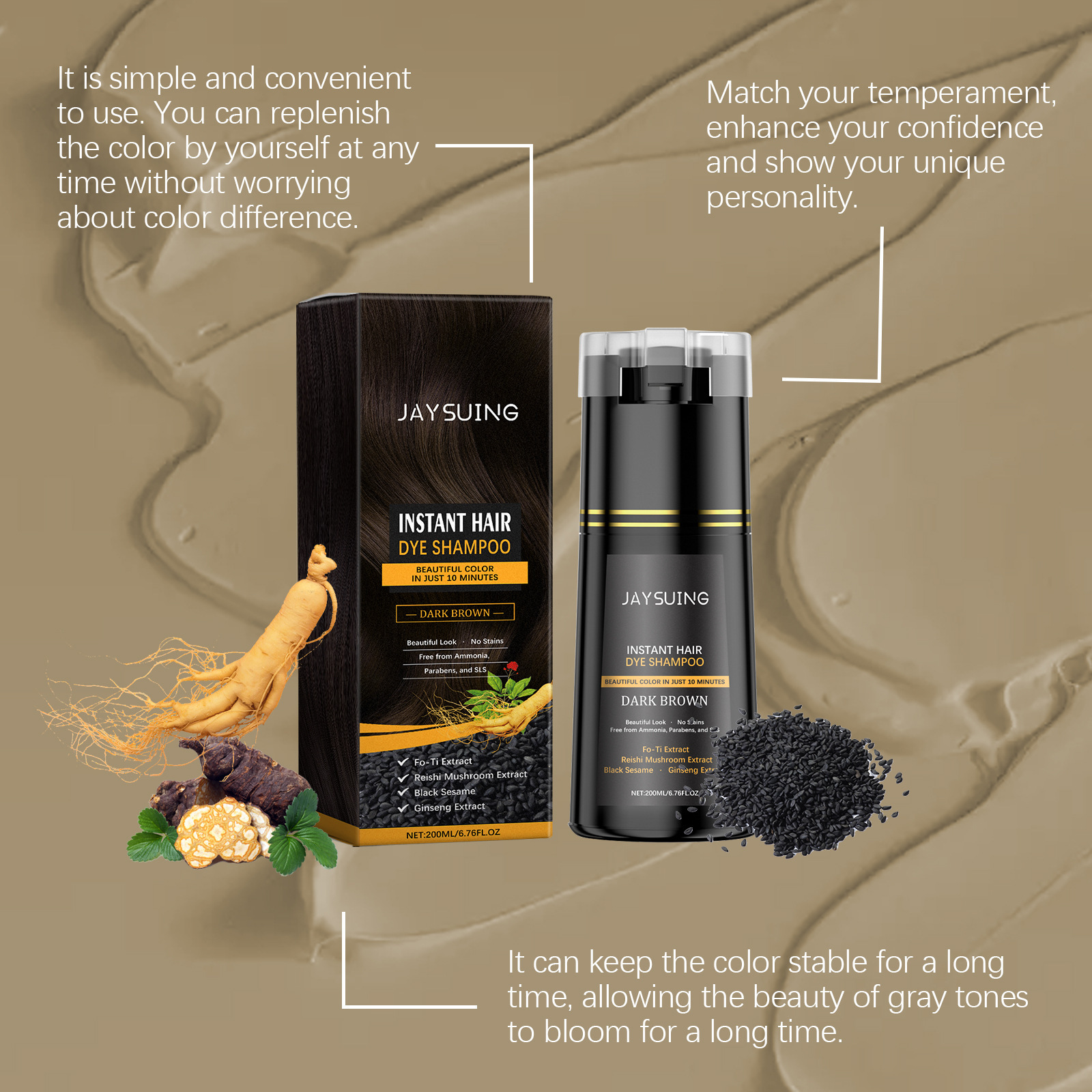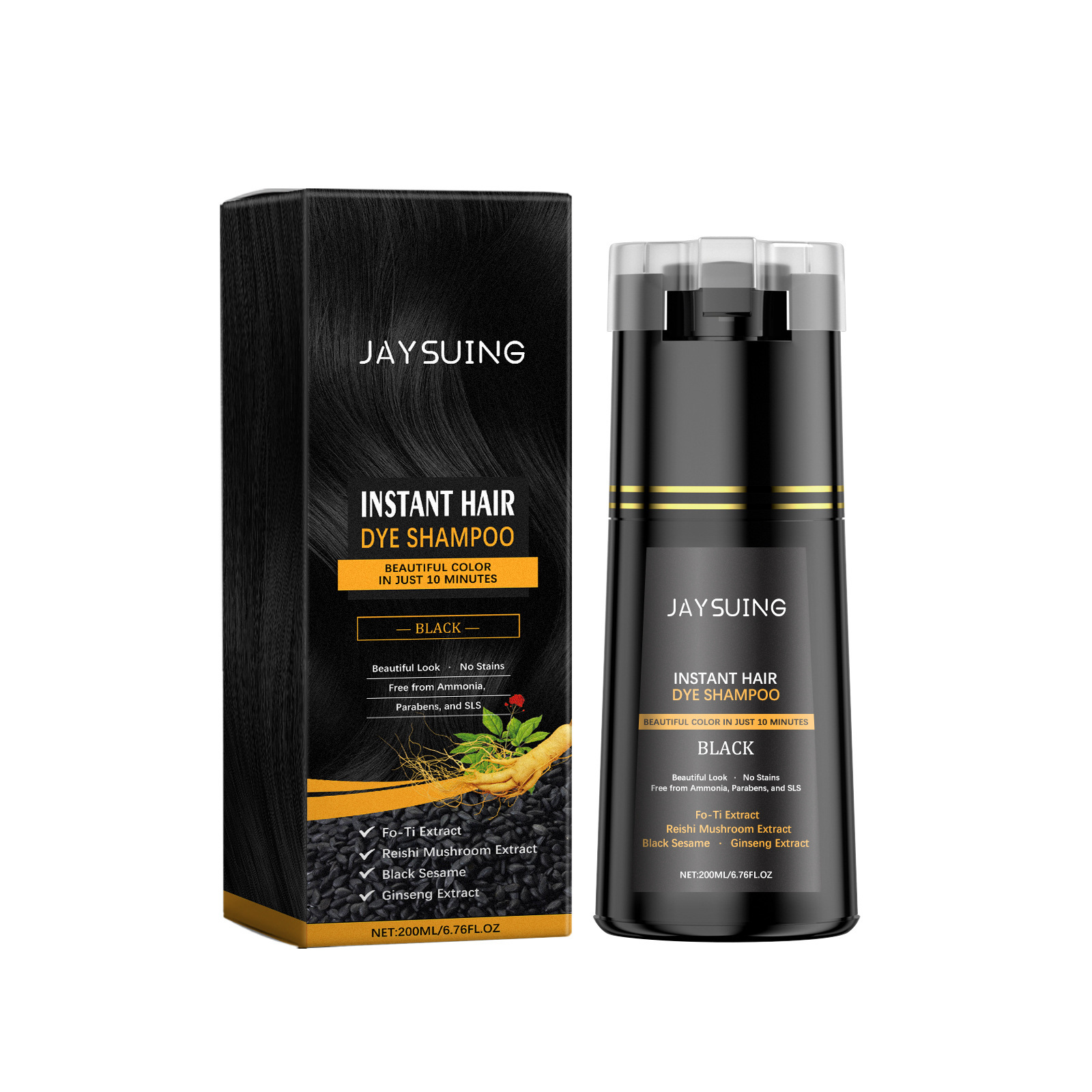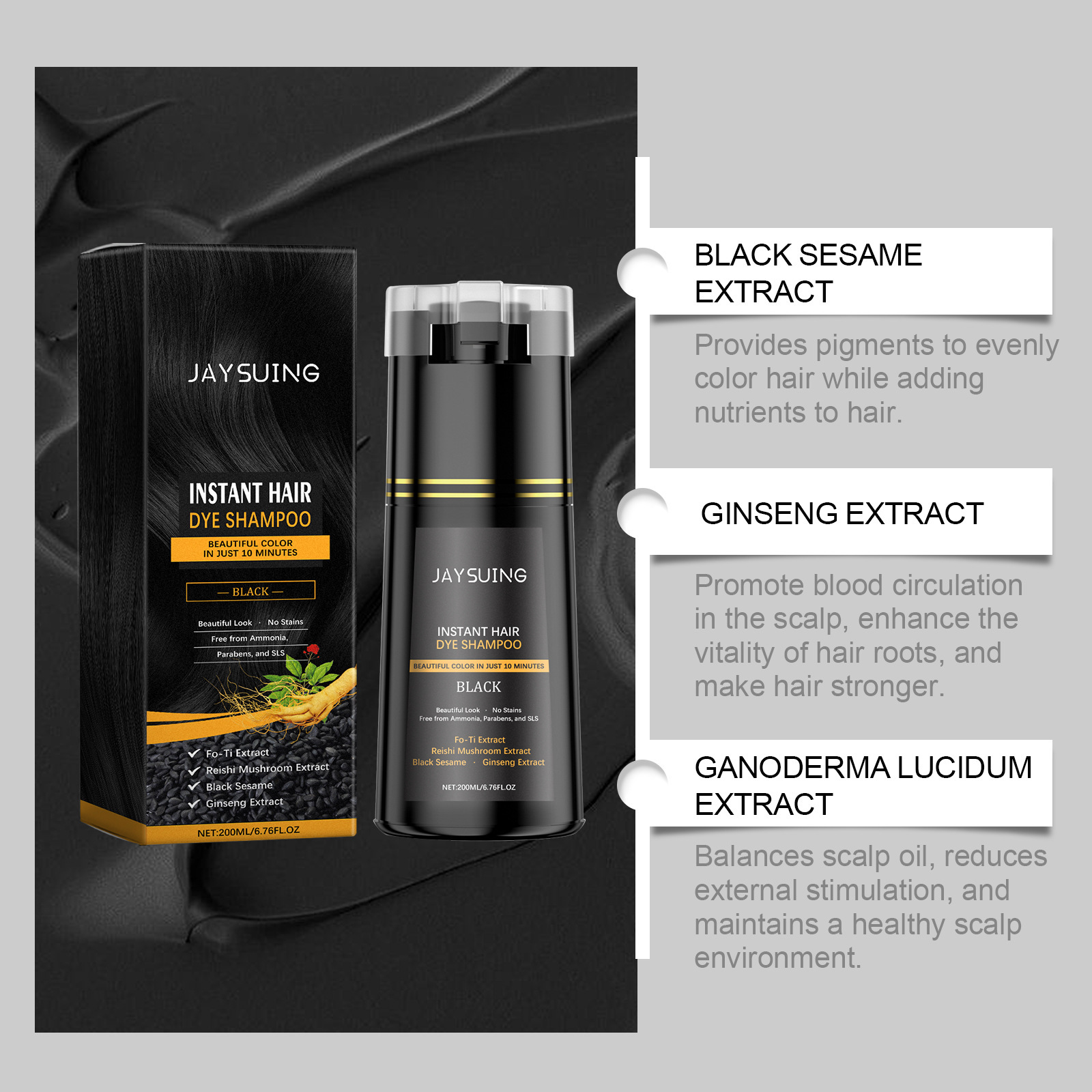Product ingredients: water, lauryl alcohol Polyether sodium sulfate, Hydroxyethyl Cellulose, p-phenylenediamine, Methyl isothiazolinone, herbal polygon extract, Ganoderma lucidum extract, black sesame extract, ginseng extract