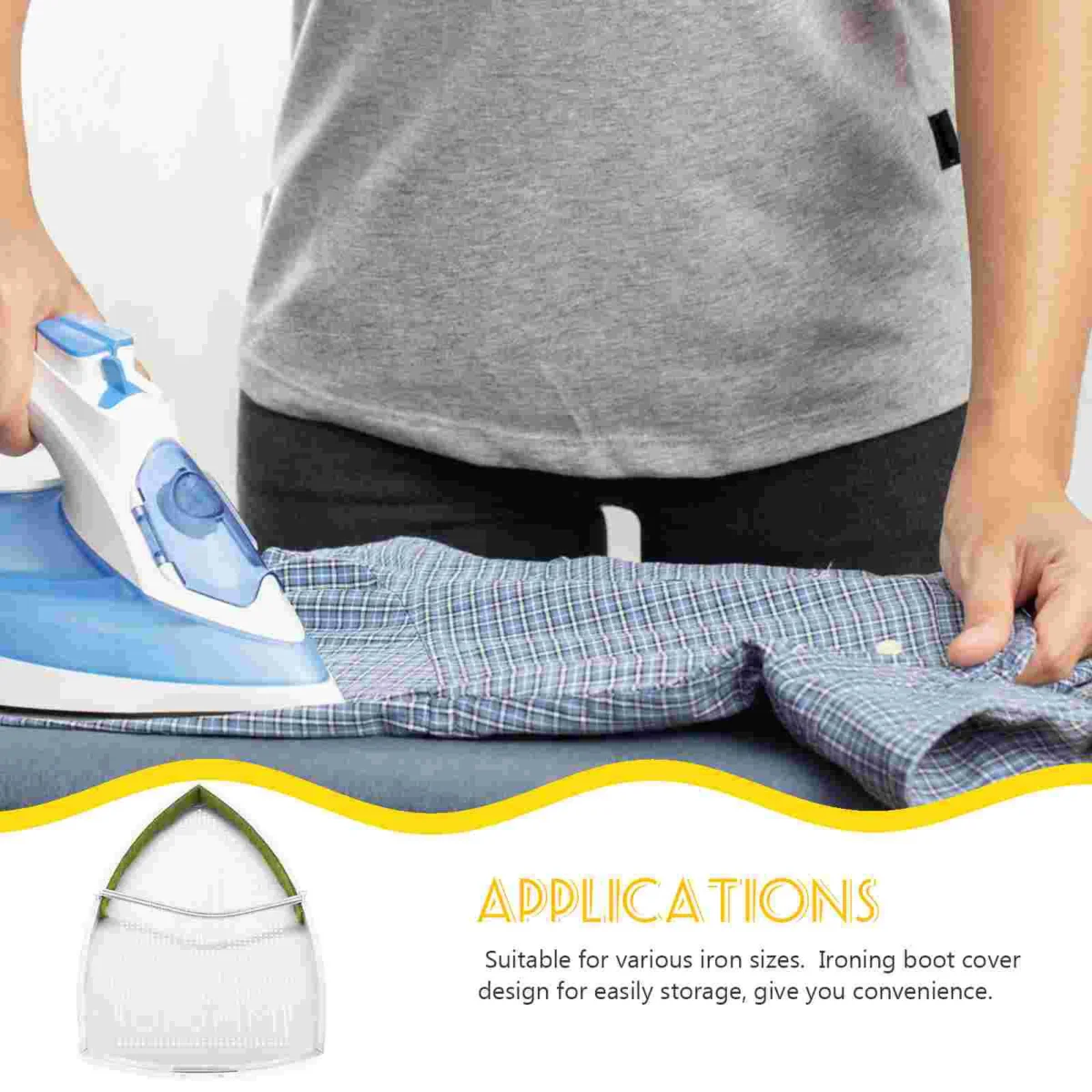 The iron shoe cover Board Protector is designed to fit any size of household iron. It allows iron setting for all types of fabrics-cotton, linen and silk. Protect fabric from . It is easy to install and convenient to use. This iron shoe cover can give you more convenience to use.