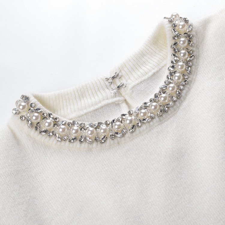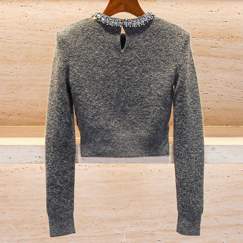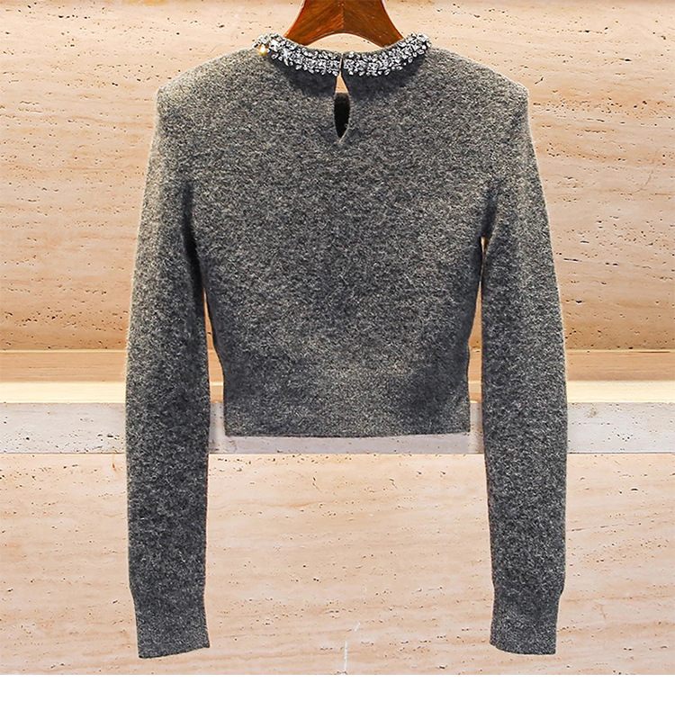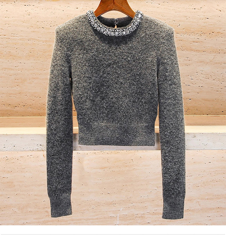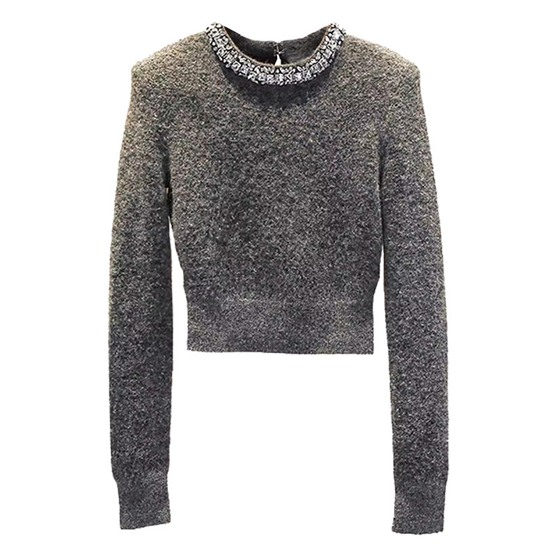 Rhinestone-embellished Crew-neck Cropped Figure-flattering Knit Sweater For Petite Women