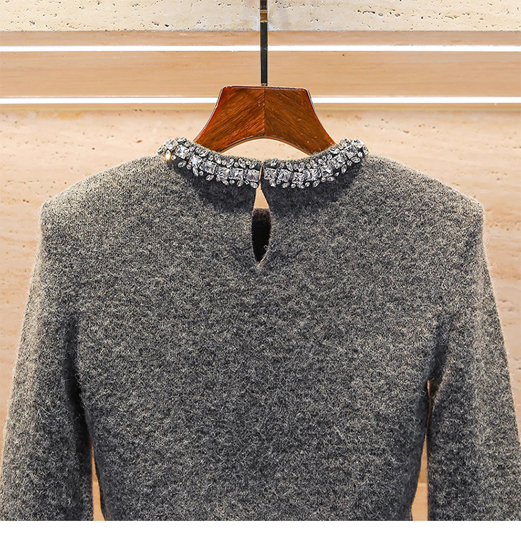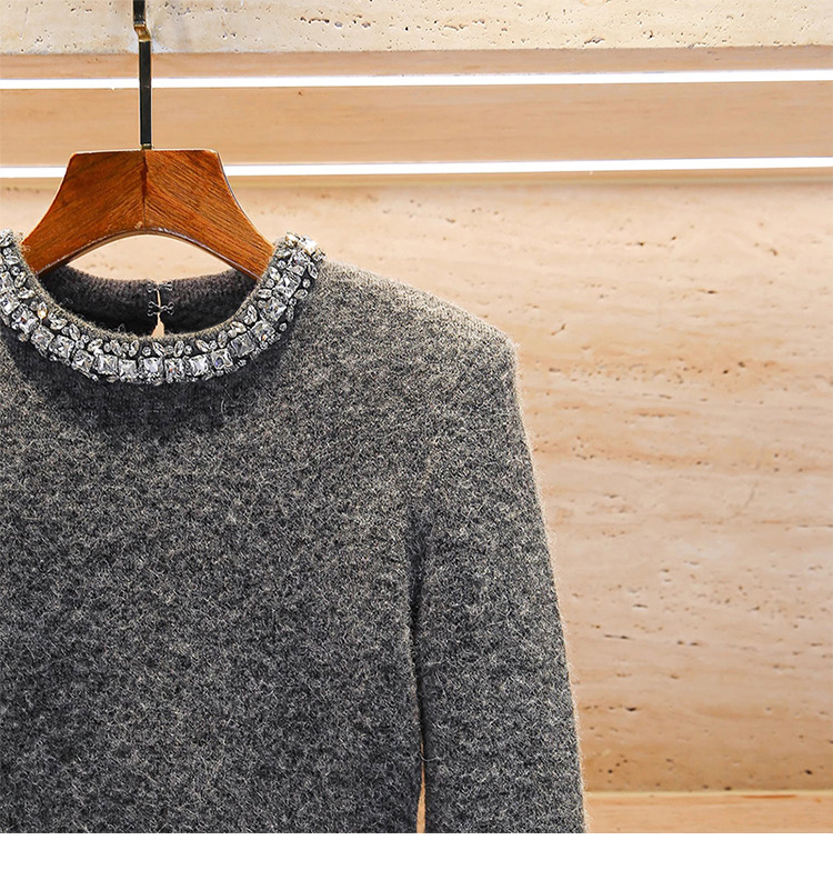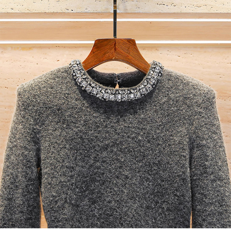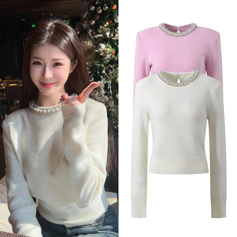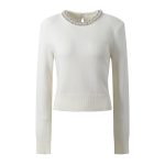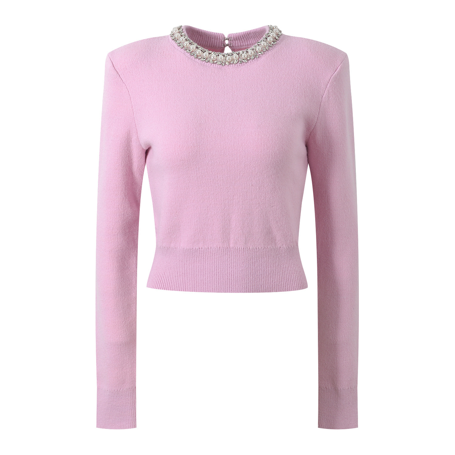 Rhinestone-embellished Crew-neck Cropped Figure-flattering Knit Sweater For Petite Women