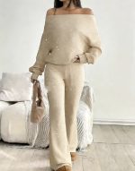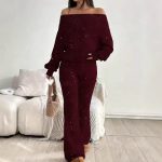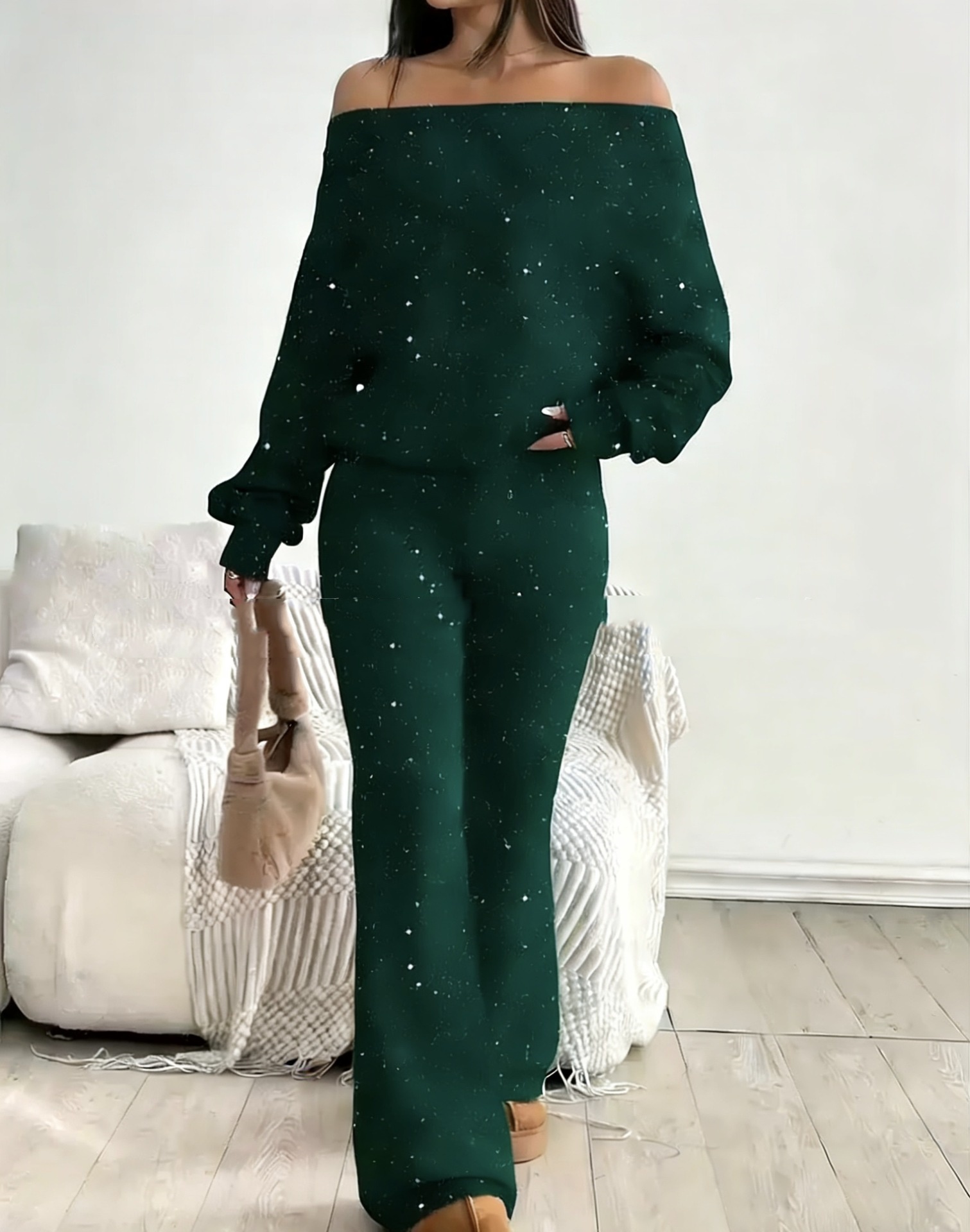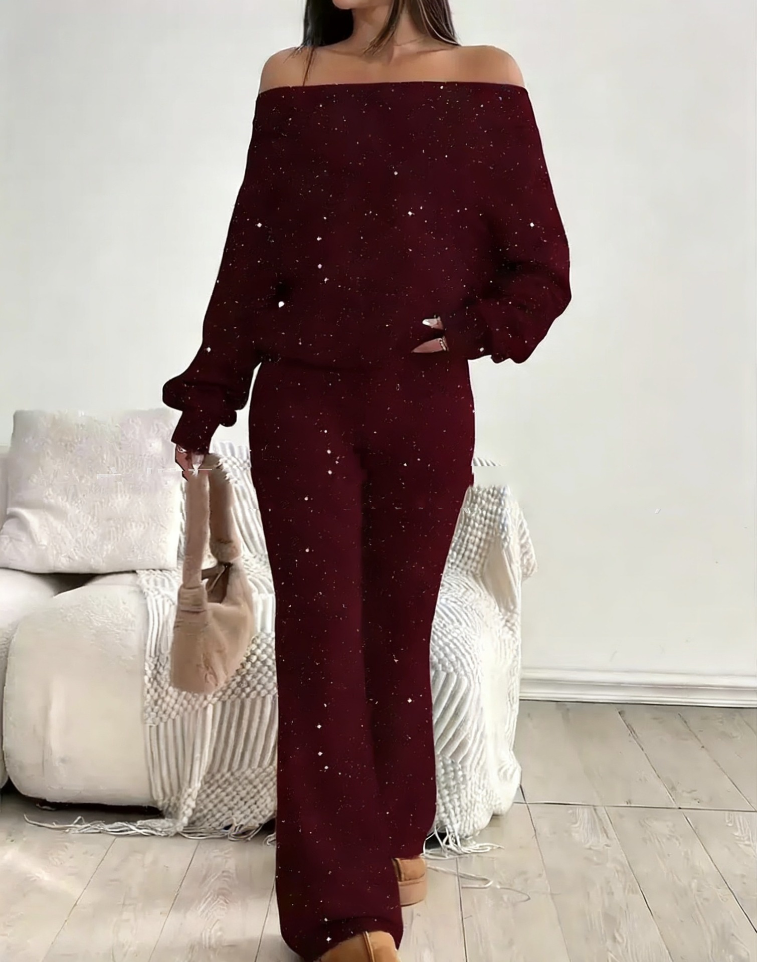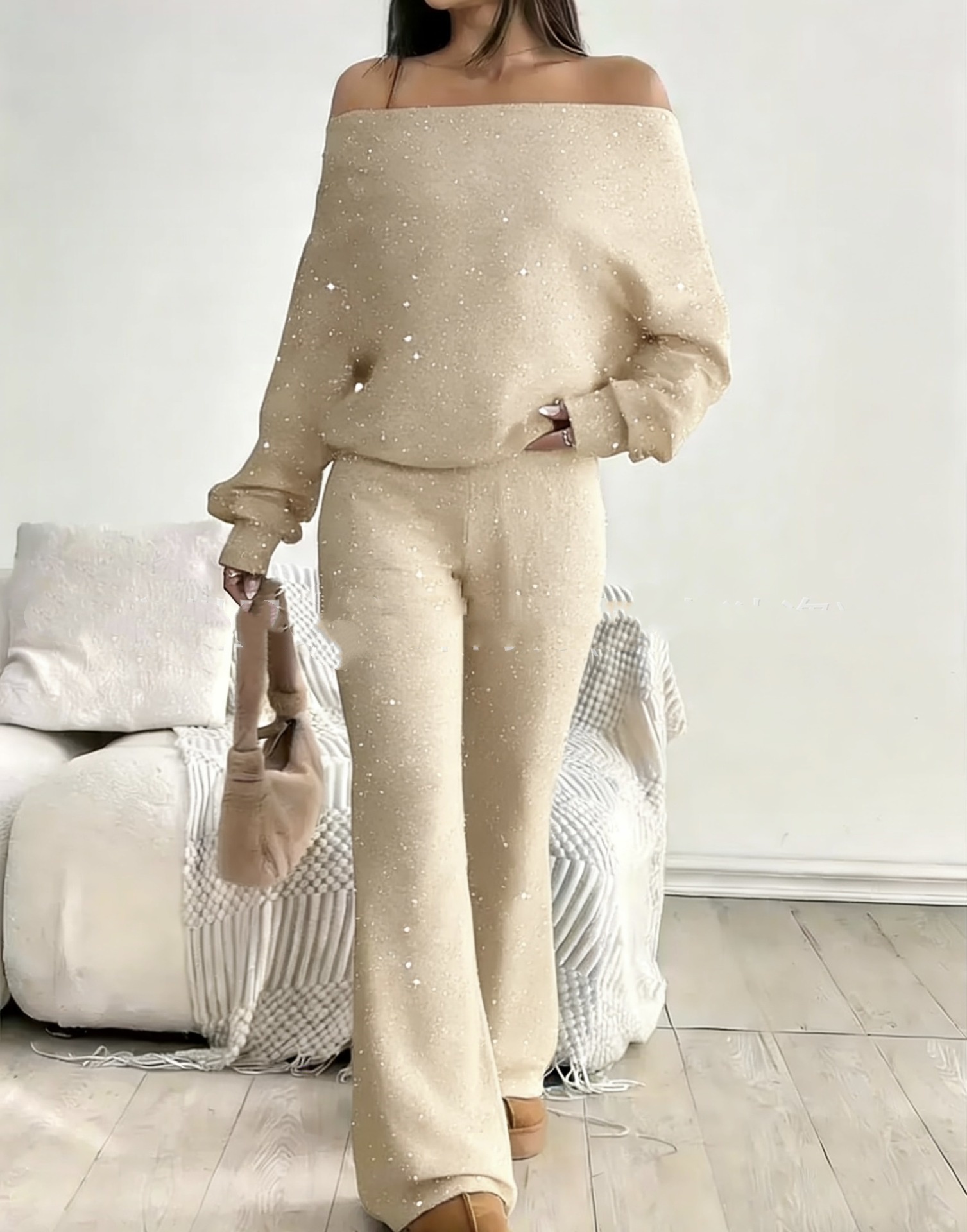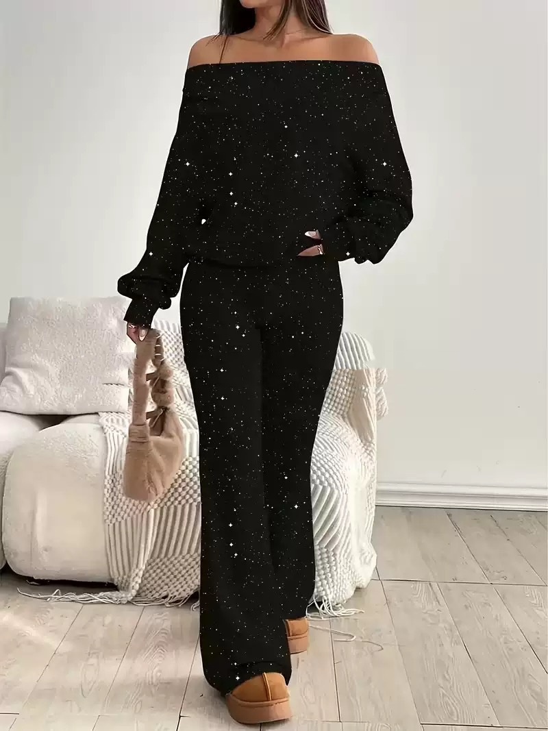 Sequined Off-the-Shoulder Long Solid-Color Womens Suit