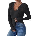 Solid-color V-neck Lace-panel Long-sleeve T-shirt Top For Womenelegant Style